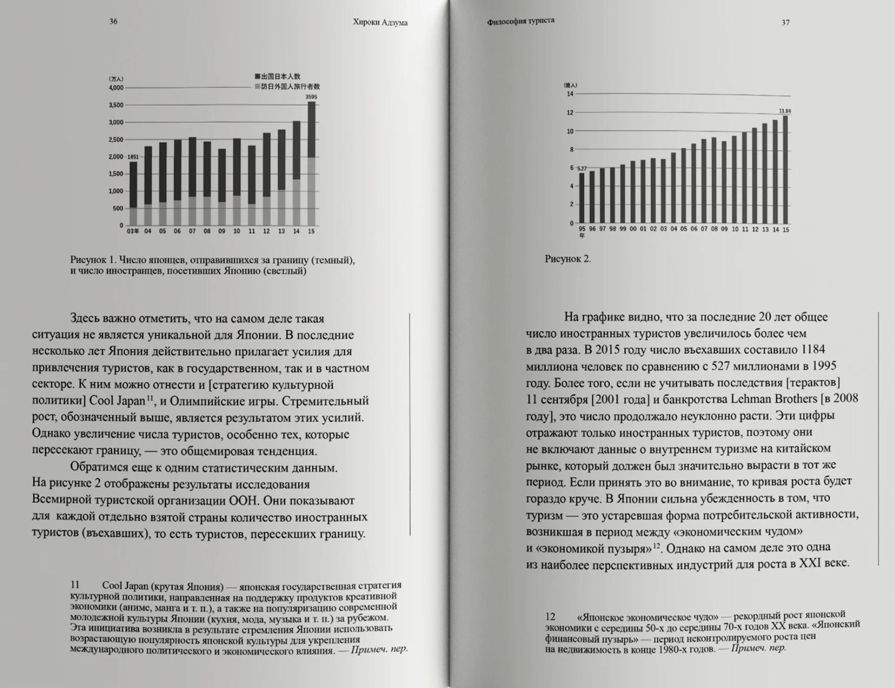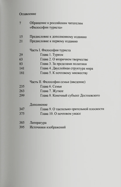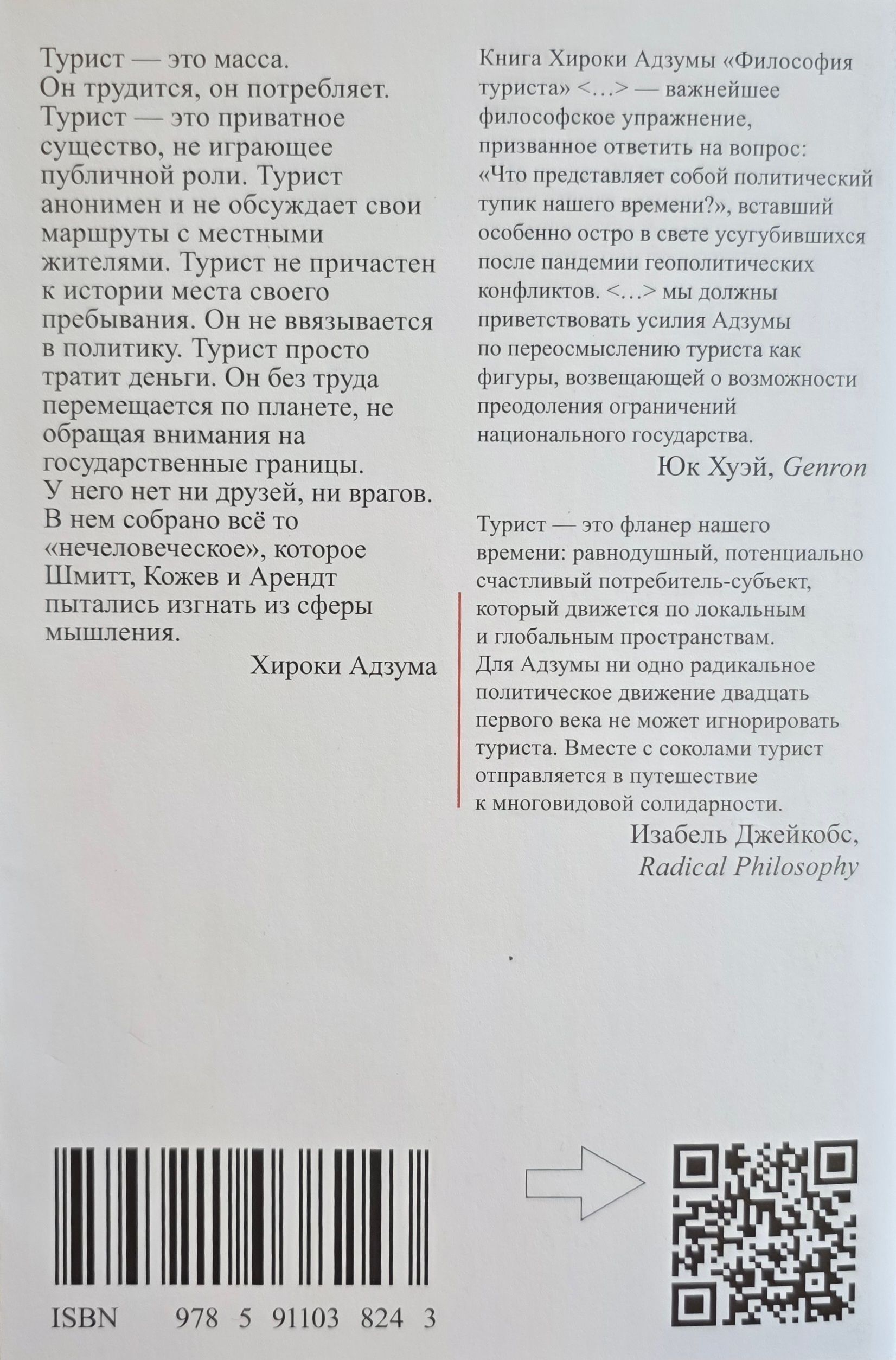 Независимый японский философ и культурный критик Адзума Хироки (род. 1971) видит в фигуре туриста метафору Другого, символ незавершенности, случайности и открытости — того способа бытия, который может стать ответом на вызовы мира, где глобализация и национализм не столько противостоят друг другу, сколько странным образом сосуществуют; мира кризиса публичного и приватного, своего и чужого… Согласуясь с самим предметом исследования, автор отказывается от попыток выстроить гомогенную теорию, но соединяет философский анализ, эссеистику, математику, поездки в Чернобыль и наблюдения за повседневной жизнью. Через рассуждения о туризме, семье, феномене «жуткого», вторичном творчестве, интерфейсах и Достоевском Адзума выстраивает спекулятивную карту современности, где случайность становится не угрозой, а условием рождения нового. «Философия туриста» — не книга «о туристе», но книга, предлагающая мыслить «как турист»: непринужденно и свободно ради нового понимания солидарности.