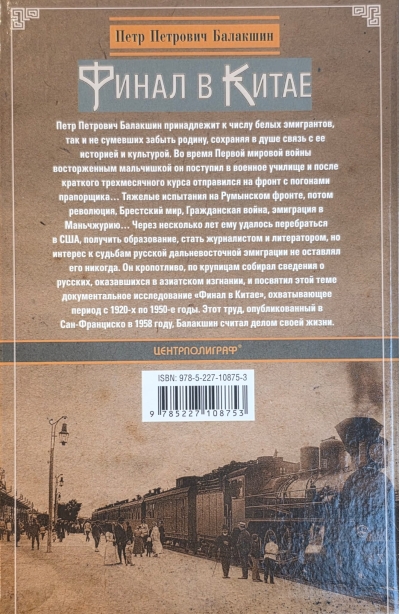 Петр Петрович Балакшин принадлежит к числу белых эмигрантов, так и не сумевших забыть родину, сохраняя в душе связь с ее историей и культурой. Во время Первой мировой войны восторженным мальчишкой он поступил в военное училище и после краткого трехмесячного курса отправился на фронт с погонами прапорщика… Тяжелые испытания на Румынском фронте, потом революция, Брестский мир, Гражданская война, эмиграция в Маньчжурию… Через несколько лет ему удалось перебраться в США, получить образование, стать журналистом и литератором, но интерес к судьбам русской дальневосточной эмиграции не оставлял его никогда. Он кропотливо, по крупицам собирал сведения о русских, оказавшихся в азиатском изгнании, и посвятил этой теме документальное исследование «Финал в Китае», охватывающее период с 1920-х по 1950-е годы. Этот труд, опубликованный в Сан-Франциско в 1958 году, Балакшин считал делом своей жизни.
