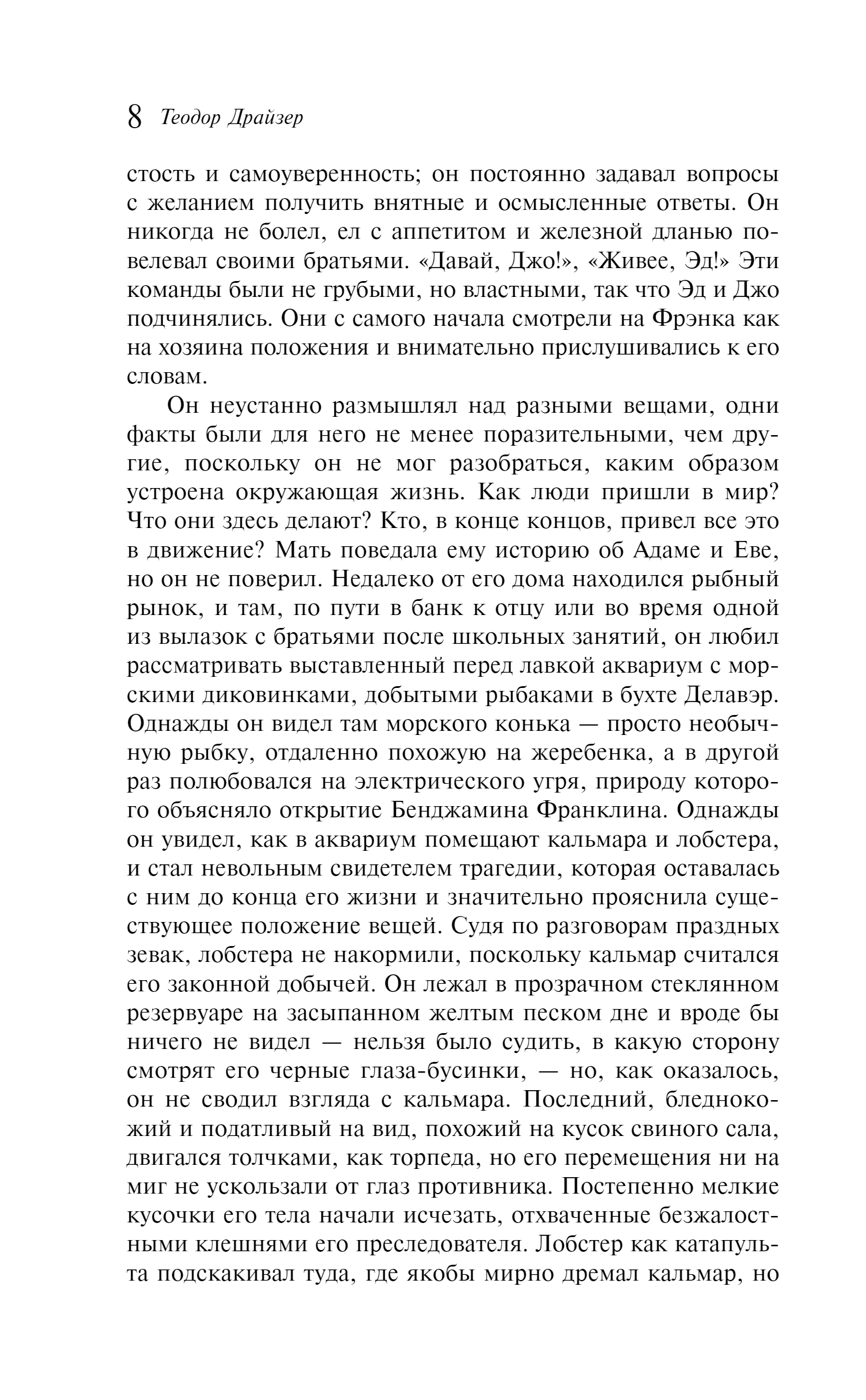 Теодор Драйзер давно занял почетное место среди классиков мировой литературы. «Финансист» — первая часть знаменитой «Трилогии желания» Теодора Драйзера, в основу которой положена история жизни американского миллионера Чарльза Йеркса, сыгравшего значительную роль в разработке системы общественного транспорта в Чикаго и Лондонского метрополитена. Главный герой — Фрэнк Каупервуд — появляется на свет в семье мелкого банковского служащего, но благодаря незаурядному уму, железной воле и необычайной целеустремленности зарабатывает огромное состояние. Он попадает в мир роскоши и больших денег, оказывается в круговороте крупнейших финансовых операций, вращается в обществе лучших дельцов своего времени. Постепенно амбициозный юноша превращается в беспринципного, властного и жаждущего наживы миллионера.