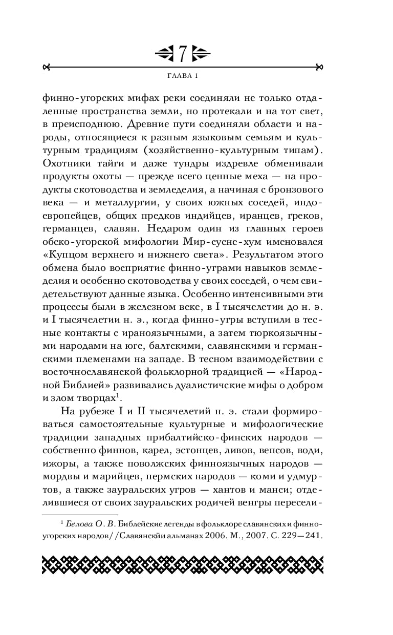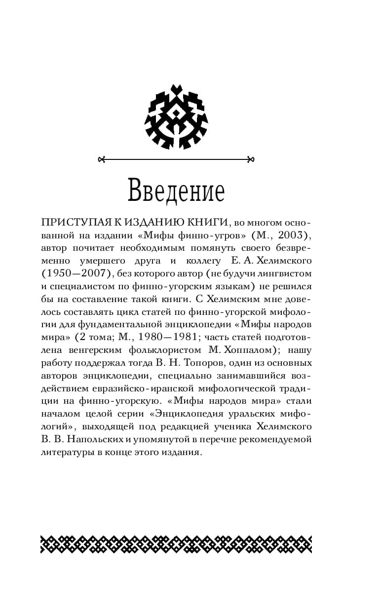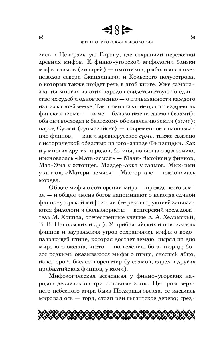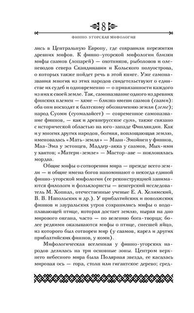 С древнейших времен финно-угры обитали на лесных просторах севера Восточной Европы и Западной Сибири. От Финляндии и Карелии на Западе до Зауралья на Востоке. В начале нашей эры стали формироваться самостоятельные мифологические традиции западных прибалтийско-финских народов — собственно финнов и карелов, эстонцев, поволжских финских народов — мордвы и марийцев, пермских народов — коми и удмуртов, а также зауральских угров — хантов и манси, создавших богатейшую мифологию. На протяжении тысячелетий финно-угры были связаны со своими соседями — иранцами (в древности), славянами и тюрками, и эти связи, отраженные в книге, повлияли на их мифологию. К финно-угорской мифологии близки передаваемые в данном издании красочные мифы саамов (лопарей) — охотников, рыболовов и оленеводов севера Скандинавии и Кольского полуострова.