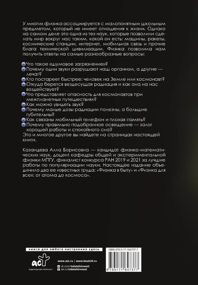 Казанцева Алла Борисовна — кандидат физико-математических наук, доцент кафедры общей и экспериментальной физики МПГУ, финалист конкурса РАН 2019 и 2021 за лучшие работы по популяризации науки. Настоящее издание объединило два ее известных труда: ≪Физика в быту≫ и ≪Физика для всех: от атома до космоса≫.