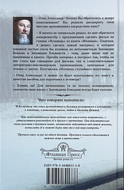 Книга протоиерея Александра Торика «Флавиан. Исповедь случайного попутчика» написана в жанре киносценария. Главный герой произведения в ожидании рождения ребенка впервые в жизни исповедуется по ветхозаветным Заповедям Божьим и Заповедям Блаженств, и отец Флавиан помогает ему в этом.