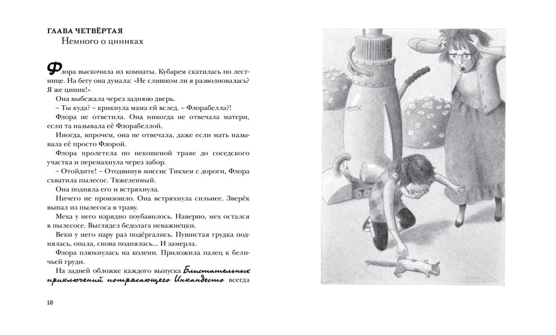 Новая история от Кейт ДиКамилло. В ней рассказывается о бельчонке Одиссее, которого девочка Флора спасла из засосавшего его пылесоса. После такого стресса у Одиссея открылись необыкновенные способности, словно он стал супергероем. За эту книгу ДиКамилло получила почётную награду – медаль «Национальный посол детской литературы».