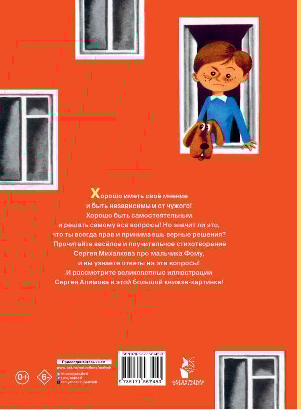 В книгу «Фома» вошло знаменитое одноимённое стихотворение Сергея Михалкова с великолепными иллюстрациями художника-классика Сергея Алимова. Сергей Михалков — поэт, драматург, публицист, сценарист, баснописец, автор трёх Гимнов нашей страны, заслуженный деятель искусств РСФСР и лауреат множества премий, самый знаменитый поэт и писатель России. Сергей Алимов — Народный художник Российской Федерации, член Российской академии художеств и Российской академии кинематографических искусств, лауреат Государственной премии Российской Федерации. Сергей Алимов работал на киностудии «Союзмультфильм», был художником-постановщиком знаменитых мультфильмов «Топтыжка» и «Каникулы Бонифация». Работал главным художником Государственного Академического Центрального театра кукол имени Образцова. Иллюстрации Сергея Алимова украшают страницы более ста книг, и эта книжка-картинка одна из них!