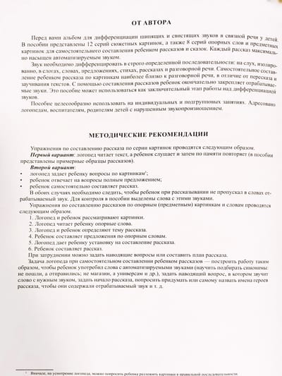 Перед вами альбом для дифференциации шипящих и свистящих звуков в связной речи у детей. В пособии представлены 12 серий сюжетных картин, а также 8 серий опорных слов и предметных картинок для самостоятельного составления ребенком рассказов и сказок. Каждый рассказ максимально насыщен автоматизируемым звуком. Звук необходимо дифференцировать в строго определенной последовательности: на слух, изолированно, в слогах, словах, предложениях, стихах, рассказах и разговорной речи. Самостоятельное составление ребенком рассказа по картинам наиболее близко к разговорной речи, в отличие от пересказа и заучивания текстов. С помощью составления рассказов ребенок окончательно закрепляет отрабатываемые звуки. Это пособие может использоваться как заключительный этап работы над дифференциацией звуком. Пособие может использоваться на индивидуальных и подгрупповых занятиях. Адресовано логопедам, воспитателям, родителям детей с нарушенным звукопроизношением.