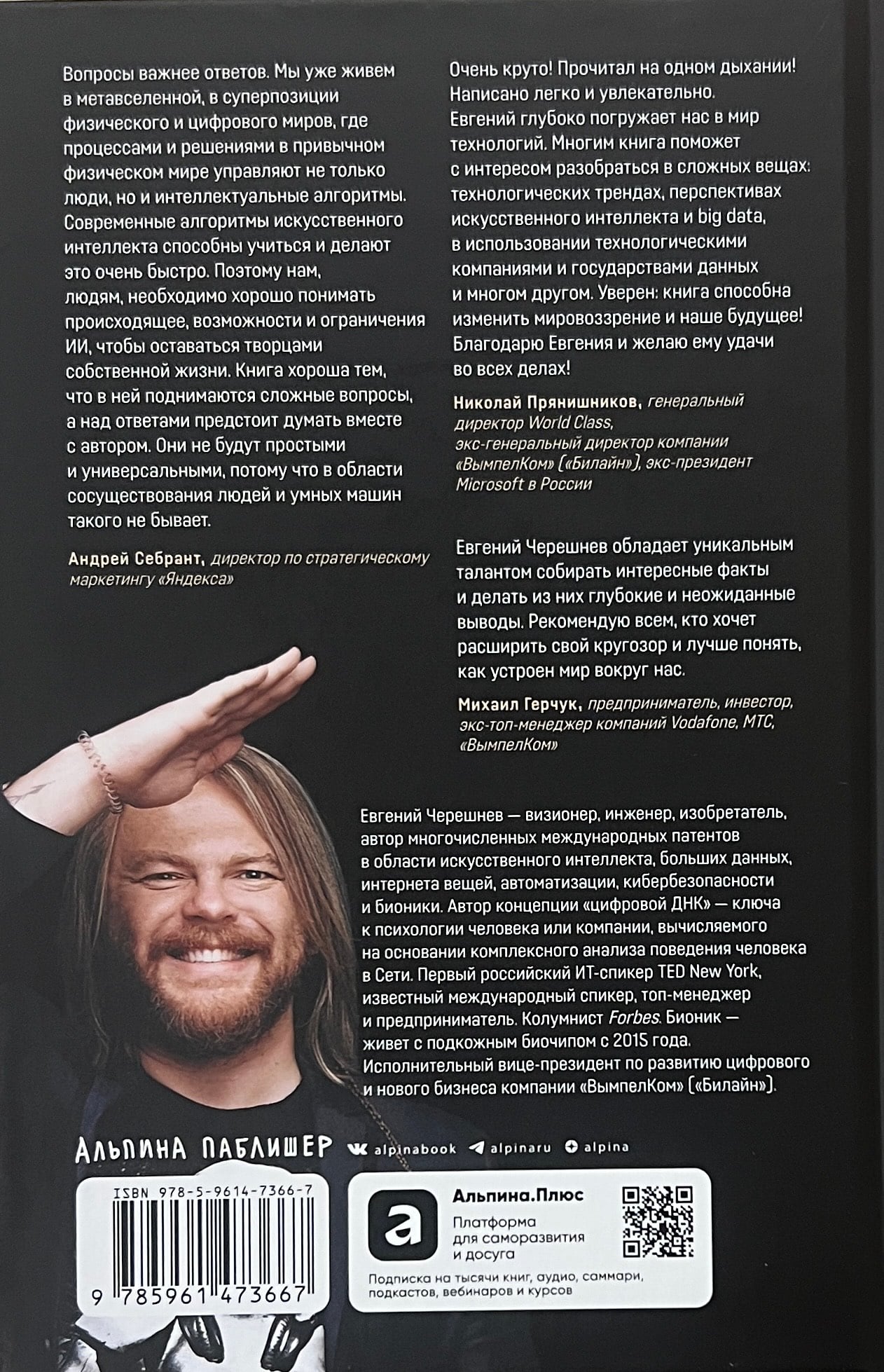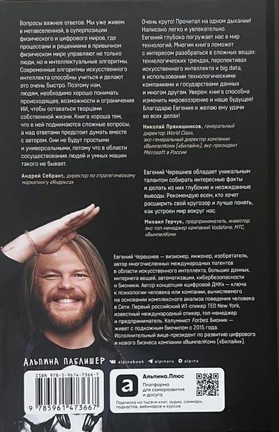 Форма жизни №4 — это люди, усиленные имплантами и искусственным интеллектом. Речь идет о недалеком будущем: уже сегодня машины могут безостановочно обучаться, ИИ становиться умнее и дешевле, а спектр его возможностей расширяется с каждым днем. Евгений Черешнев — визионер, первый российский ИТ-спикер TED New York, предприниматель и бионик — описывает ИИ как ступень в эволюции жизни на нашей планете. Автор проанализировал историю думающих машин и современных методов анализа данных, рассказал о влиянии автоматизации на социум, семью, экономику и геополитику, об инструментах защиты от трекинга и цифровых угроз. А главное — он показал, как может выглядеть мир ХХII века, где никто не сможет отключиться от глобальной сети, а нужда во многих сферах человеческой деятельности полностью отпадет. Чтобы не стать рабами в мире разумных роботов, нужно помнить о машинной этике, установить правила сбора и анализа данных и, что важнее всего, понять, как устроен и развивается искусственный разум. Об этих и многих других аспектах ИИ эта книга.