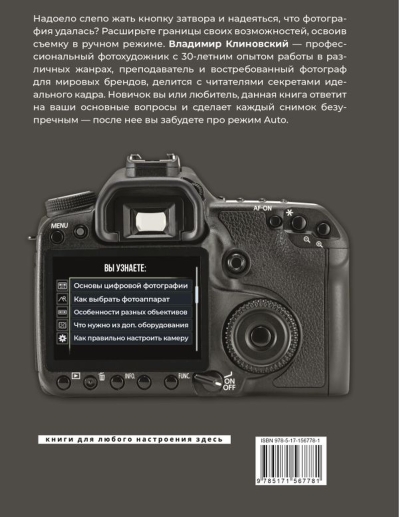 Надоело слепо жать кнопку затвора и надеяться, что фотография удалась? Расширьте границы своих возможностей, освоив съемку в ручном режиме. Владимир Клиновский — профессиональный фотохудожник с 30-летним опытом работы в различных жанрах, преподаватель и востребованный фотограф для мировых брендов, делится с читателями секретами идеального кадра. Новичок вы или любитель, данная книга ответит на ваши основные вопросы и сделает каждый снимок безупречным — после нее вы забудете про режим Auto.