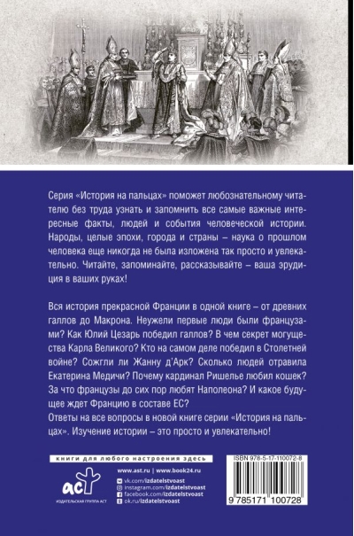 Вся история прекрасной Франции в одной книге - от древних галлов до Макрона. Неужели первые люди были французами? Как Юлий Цезарь победил галлов? В чем секрет могущества Карла Великого? Кто на самом деле победил в Столетней войне? Сожгли ли Жанну д'Арк? Сколько людей отравила Екатерина Медичи? Почему кардинал Ришелье любил кошек? За что французы до сих пор любят Наполеона? И какое будущее ждет Францию в составе ЕС? Ответ на все вопросы в новой книге серии «История на пальцах». Изучение истории - это просто и увлекательно!