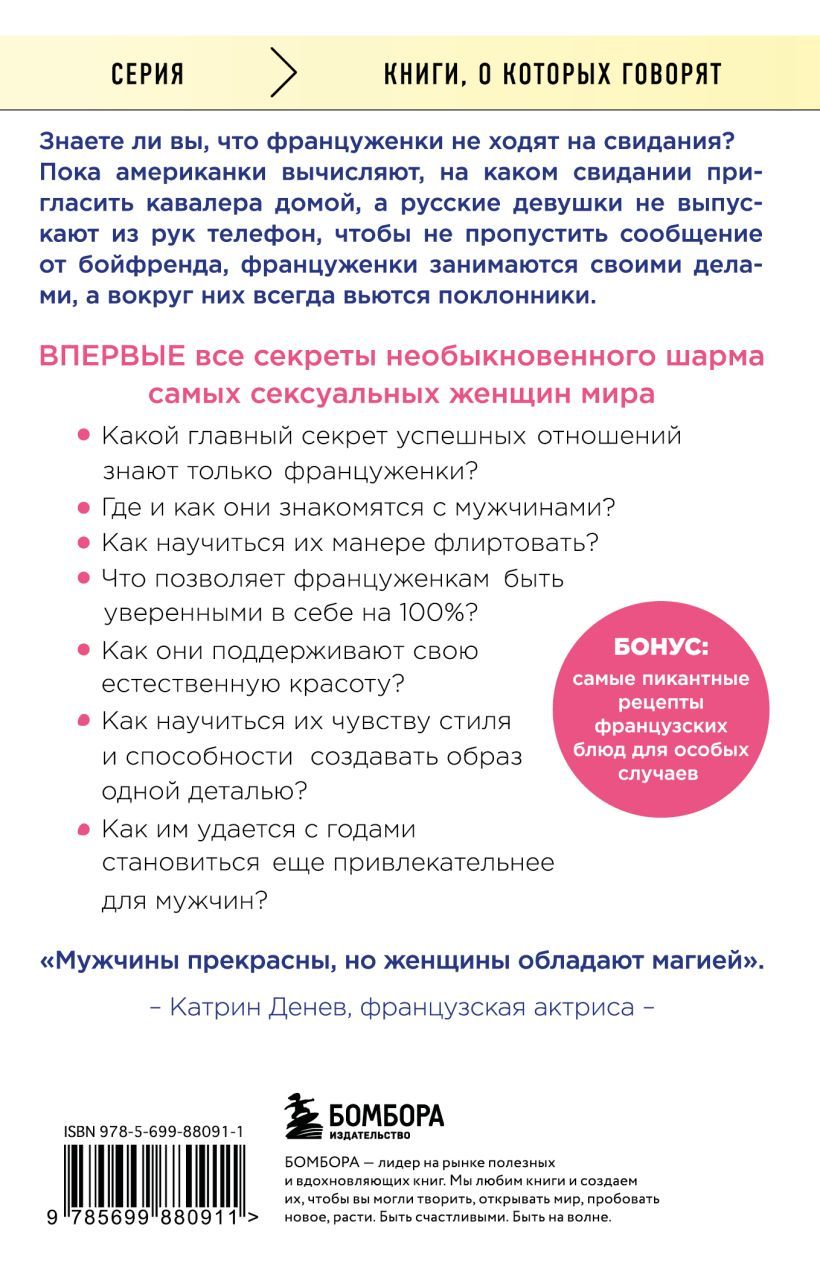 Знаете ли вы, что француженки не ходят на свидания? Пока американки вычисляют, на каком свидании пригласить кавалера домой, а русские девушки не выпускают из рук телефон, чтобы не пропустить сообщение от бойфренда, француженки занимаются своими делами, а вокруг них всегда вьются поклонники. Впервые все секреты необыкновенного шарма самых сексуальных женщин мира! Как научиться флиртовать по-французски? Как француженки с помощью одной детали гардероба создают стильные образы? Почему, даже имея небольшой опыт в любви, они так сексуальны? Какой главный секрет успешных отношений знают только француженки?