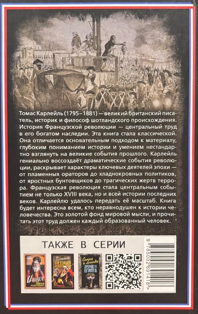 Томас Карлейль (1795–1881) – великий британский писатель, историк и философ шотландского происхождения. История Французской революции – центральный труд в его богатом наследии. Эта книга стала классической. Она отличается основательным подходом к материалу, глубоким пониманием истории и умением нестандартно взглянуть на великие события прошлого. Карлейль гениально воссоздаёт драматические события революции, раскрывает характеры ключевых деятелей эпохи – от пламенных ораторов до хладнокровных политиков, от яростных бунтовщиков до трагических жертв террора. Французская революция стала центральным событием не только XVIII века, но и всей истории последних веков. Карлейлю удалось передать ее масштаб. Книга будет интересна всем, кто неравнодушен к истории человечества. Это золотой фонд мировой мысли, и прочитать этот труд должен каждый образованный человек.