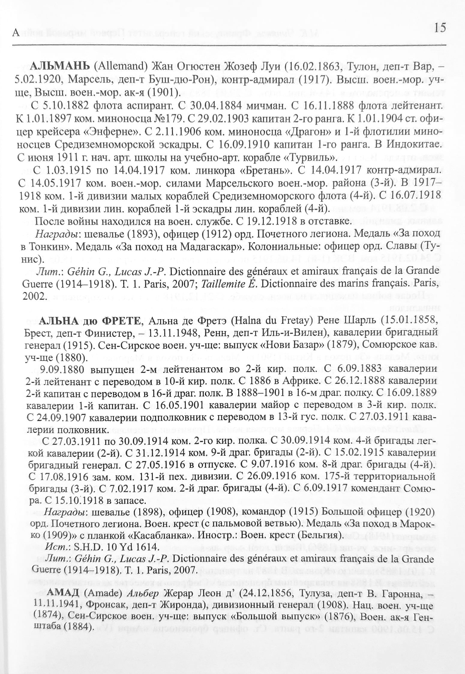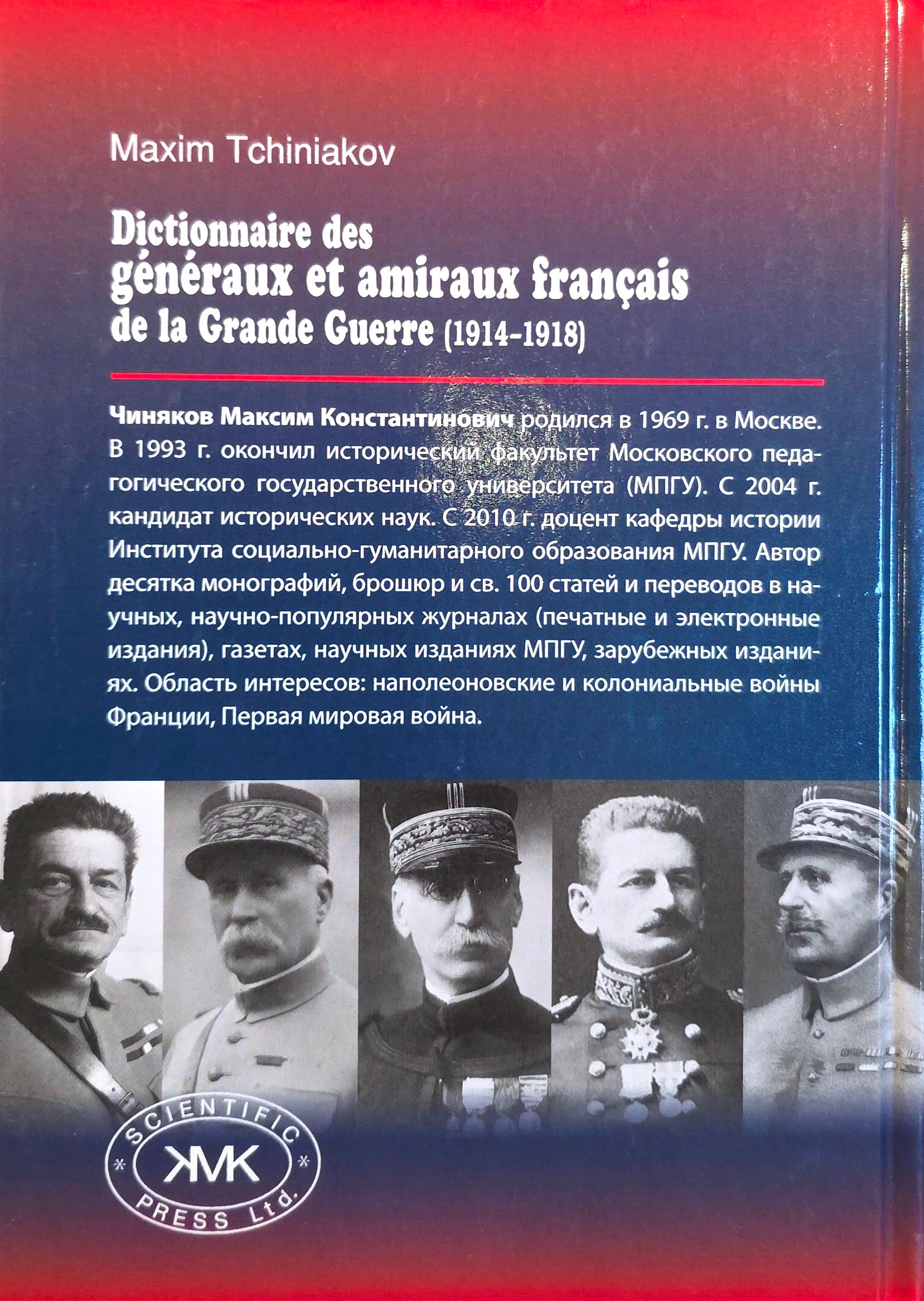 Во время Первой мировой войны Франция была одним из основных игроков и активных членов Антанты. Западный фронт, проходивший в т.ч. и по территории Франции, существовал с первого до последнего дня войны. Как следствие, французская армия в целом, и французский генералитет в честности, сыграли огромную роль войне, оказав решающее влияние на ее результат. В данной монографии впервые на русском языке представлены биографические сведения о французских генералах и адмиралах (всего 953 чел), занимавших различные посты во французской армии и военно-морском флоте в 1914-1918 гг. Книга предназначена для специалистов, а также всех, кто интересуется историей Великой войны 1914-1918 гг.
