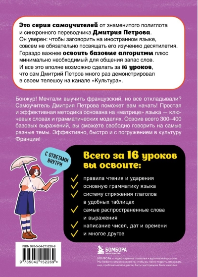 Это серия самоучителей от знаменитого полиглота и синхронного переводчика Дмитрия Петрова. Он уверен: чтобы заговорить на иностранном языке, совсем не обязательно посвящать его изучению десятилетия. Гораздо важнее освоить базовые алгоритмы, плюс — минимально необходимый для общения запас слов.