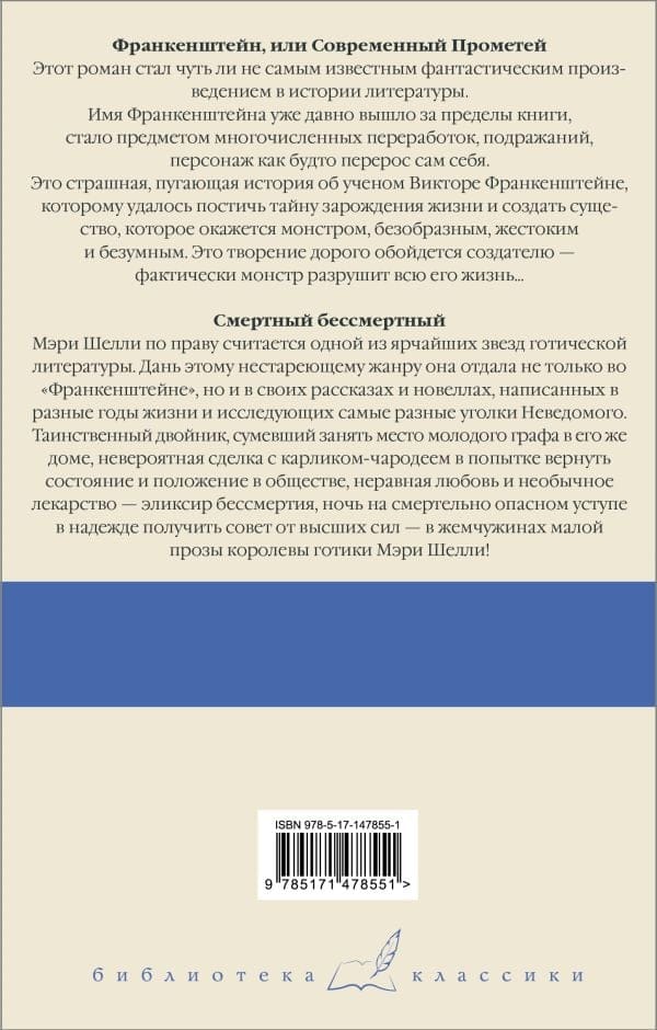 Мэри Шелли по праву считается одной из ярчайших звезд готической литературы. Дань этому нестареющему жанру она отдала не только во «Франкенштейне», но и в своих рассказах и новеллах, написанных в разные годы жизни и исследующих самые разные уголки Неведомого. Таинственный двойник, сумевший занять место молодого графа в его же доме, невероятная сделка с карликом-чародеем в попытке вернуть состояние и положение в обществе, неравная любовь и необычное лекарство — эликсир бессмертия, ночь на смертельно опасном уступе в надежде получить совет от высших сил — в жемчужинах малой прозы королевы готики Мэри Шелли!
