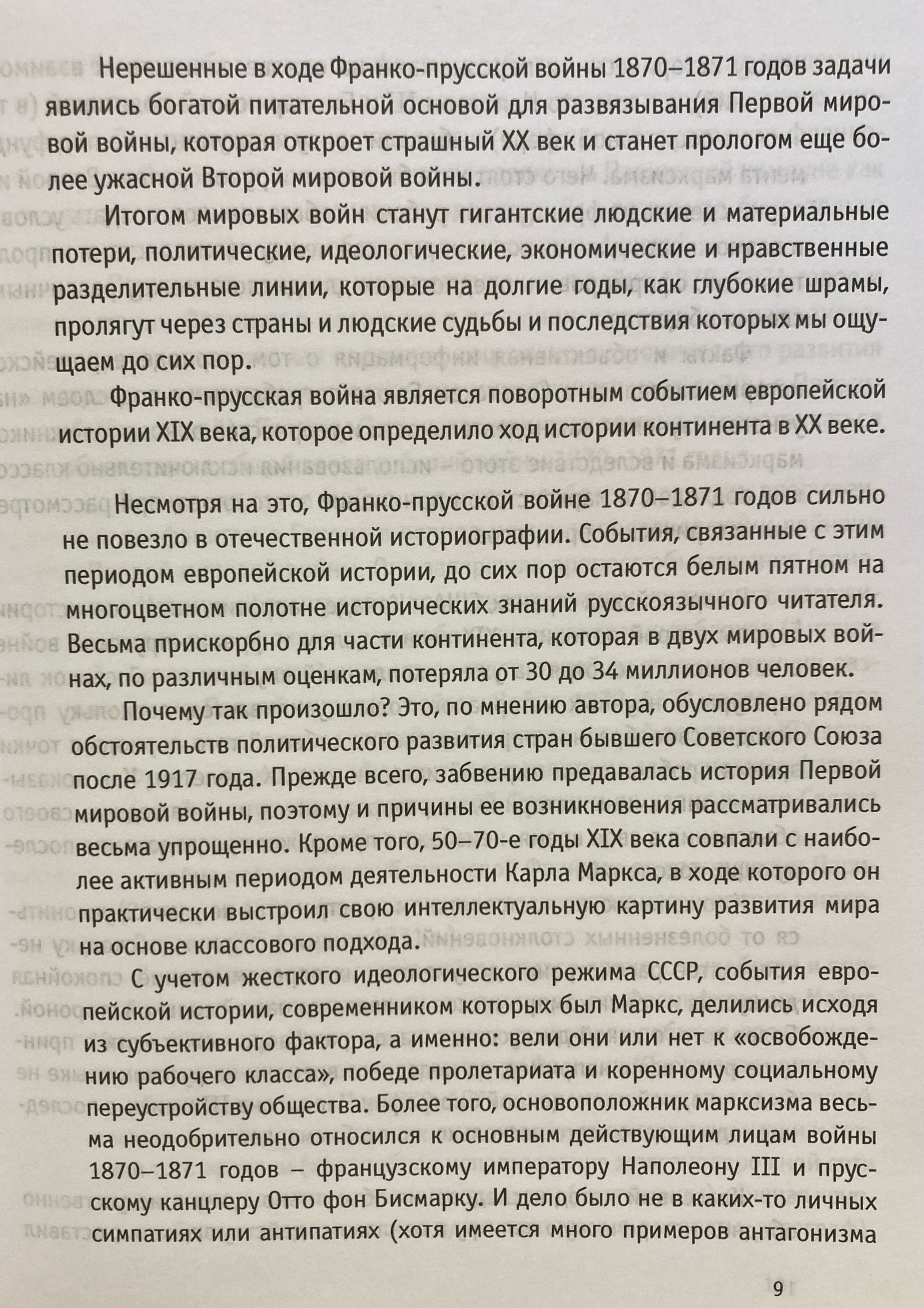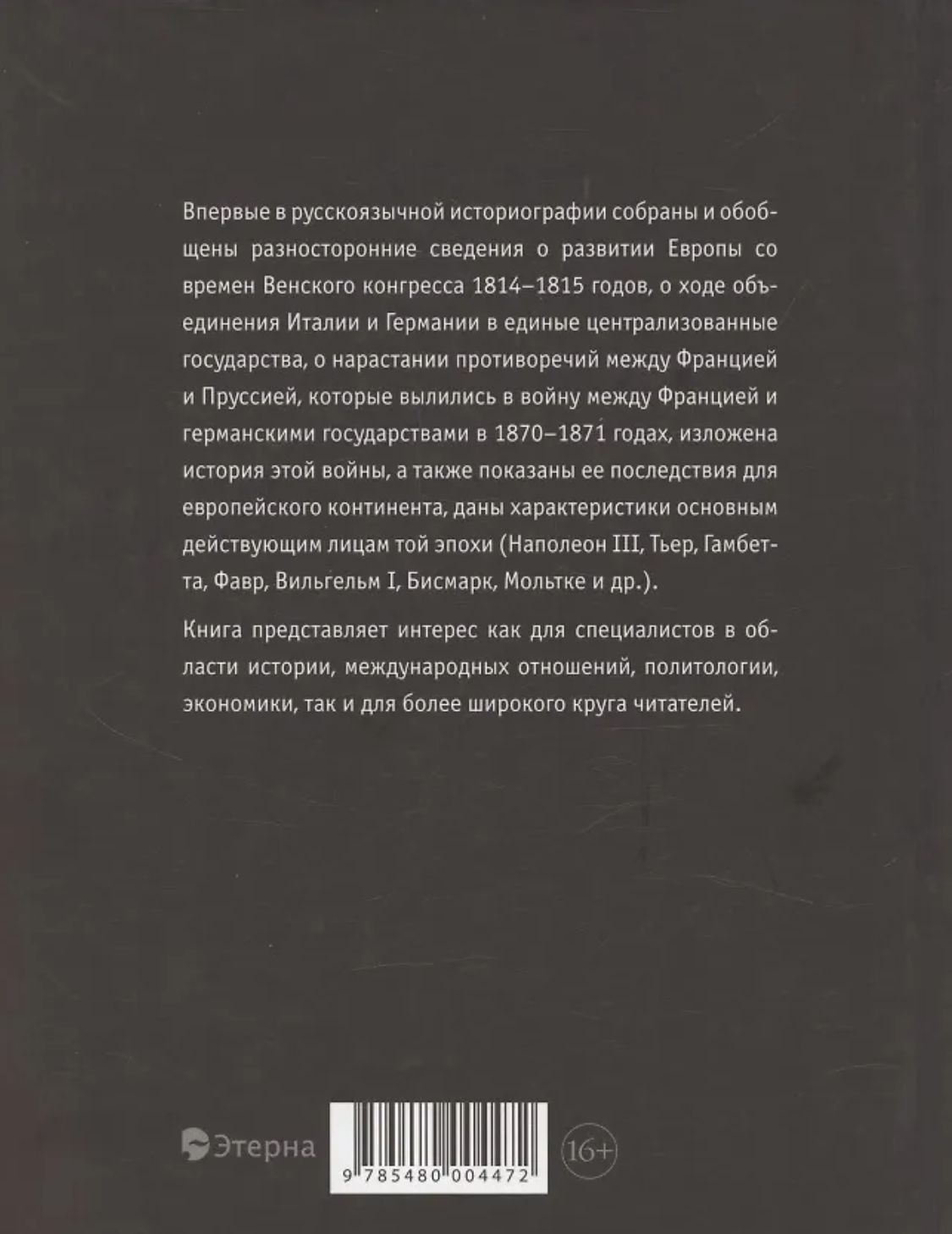 Впервые в русскоязычной историографии собраны и обобщены разносторонние сведения о развитии Европы со времен Венского конгресса 1814-1815 годов, о ходе объединения Италии и Германии в единые централизованные государства, о нарастании противоречий между Францией и Пруссией, которые вылились в войну между Францией и германскими государствами в 1870-1871 годах. Изложена история этой войны, а также показаны ее последствия для европейского континента, даны характеристики основным действующим лицам той эпохи (Наполеон III, Тьер, Гамбетта, Фавр, Вильгельм I, Бисмарк, Мольтке и др.).