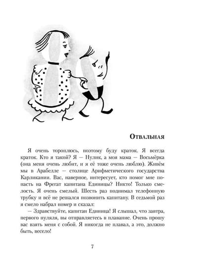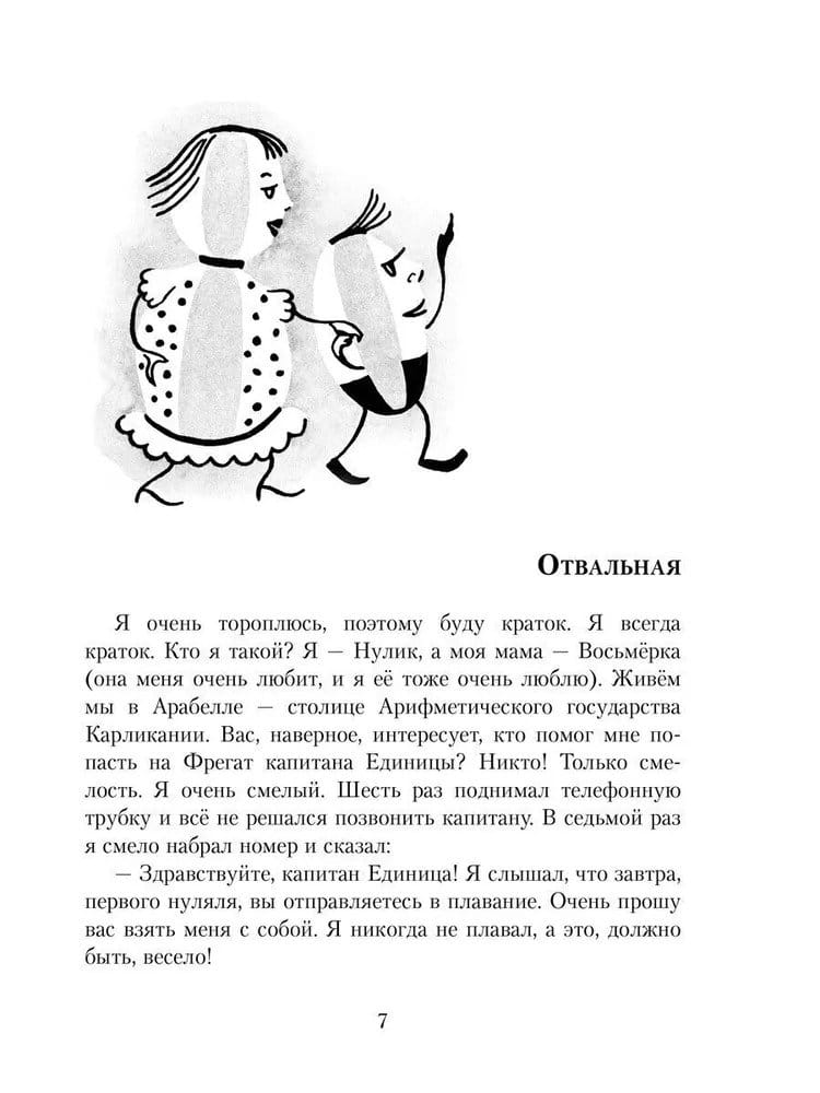 Озорной Нулик, житель математической страны Карликании, не представляет свою жизнь без приключений. Даже строгая мама-Восьмерка не может удержать его дома. Вот и сейчас нулик отправляется в захватывающее путешествие по геометрическим морям и океанам на Фрегате под командой мудрого капитана Единицы. Волшебному кораблю предстоит проплыть мимо жаркого Бамбукового острова, побывать в порту Максимум и проливе Бесконечности. В плавании команду ожидают необычайные приключения и множество удивительных открытий. В далеком 1968 году Владимир Левшин написал свой «Фрегат капитана Единицы», который, как и первые две его книги о математической стране, проиллюстрировала Наталия Антокольская. Спустя десять лет Владимир Артурович переписал историю о морских приключениях своего непоседливого героя и выпустил ее в свет с рисунками Вячеслава Сергеева. Эту редакцию повести и переиздавали во все последующие годы. И только сегодня к читателю возвращается книга в своем первоначальном виде.