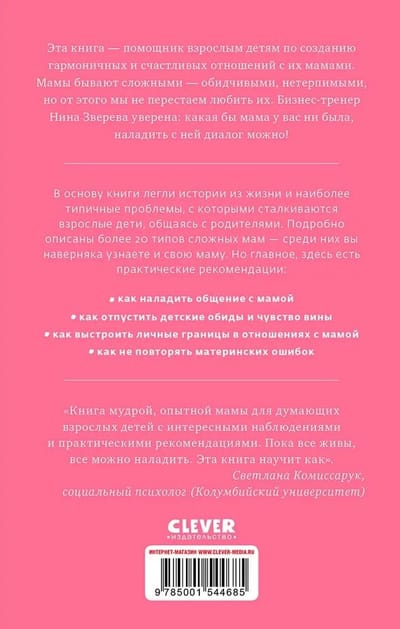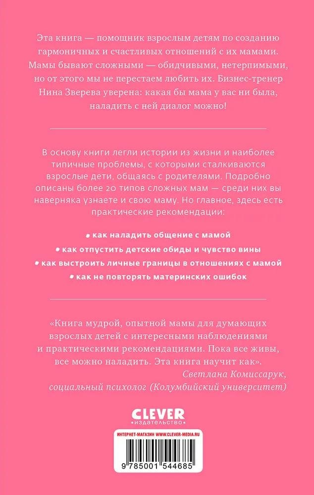 В основу книги легли истории из жизни и наиболее типичные проблемы, с которыми сталкиваются взрослые дети, общаясь с родителями. Подробно описаны более 20 типов сложных мам - среди них вы наверняка узнаете и свою маму.