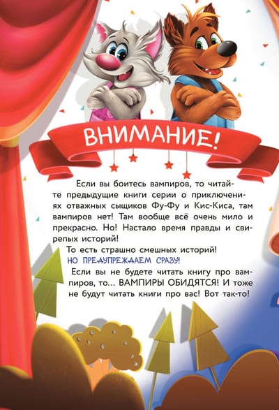 Гениальные сыщики пёс Фу-Фу и кот Кис-Кис распутают любое запутанное дело! От их острого ума (и острых когтей Кис-Киса), смекалки и сильных лап ещё не ушёл ни один бандит. Как-то раз они даже столкнулись с настоящим призраком! Но смогли спасти Скверный лес от древнего проклятия. А теперь их ждёт новая напасть! Гораздо… гораздо опаснее всех предыдущих. В окрестностях леса объявился вампир! Смогут ли отважные пёс и кот противостоять этому ужасному зверю? Разгадают ли жуткую тайну и распутают ли загадочное преступление, следы которого ведут в неизвестность? Вот в чём вопрос! Да, и конечно, Кролик от всего этого в восторге.