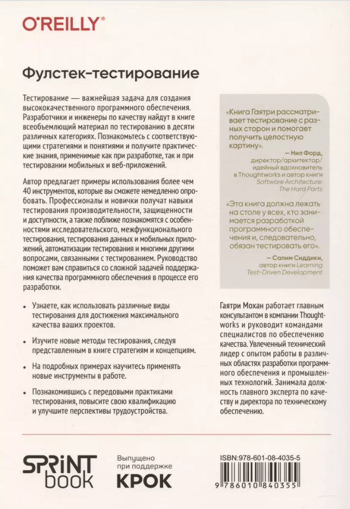 Тестирование — важнейшая задача для создания высококачественного программного обеспечения. Разработчики и инженеры по качеству найдут в книге всеобъемлющий материал по тестированию в десяти различных категориях. Познакомьтесь с соответствующими стратегиями и понятиями и получите практические знания, применимые как при разработке, так и при тестировании мобильных и веб-приложений.