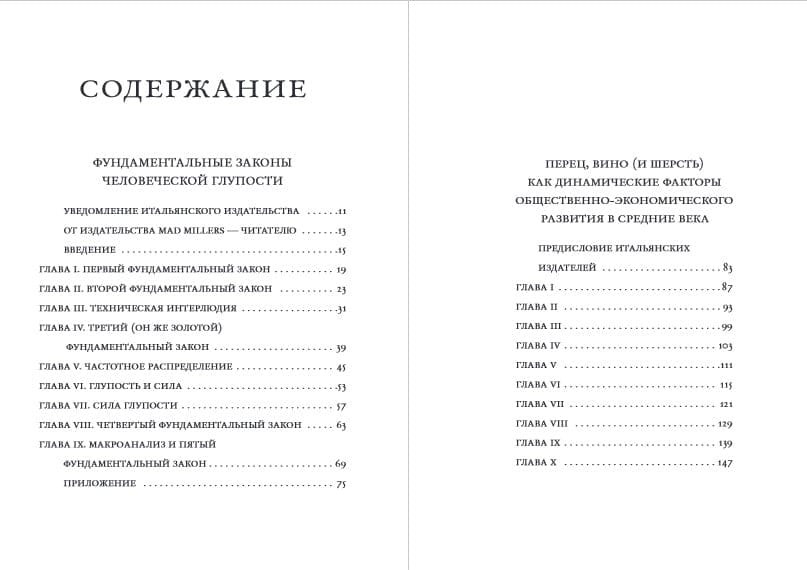 Впервые остроумно и изящно сформулированы законы человеческой глупости — феномена мощного и извечного, как явления природы. Есть ли глупцы среди нобелевских лауреатов, чем отличается глупец от бандита, каков ущерб, который глупец наносит общему делу, много ли глупцов в популяции, как распознать и нейтрализовать их «темную силу» — ответы на эти насущные вопросы в великолепной работе историка экономики Карло Чиполлы. Одновременно «эта книжица ни в коем случае не является ни порождением цинизма, ни упражнением в пораженчестве», ибо она полна юмора (или сарказма), вполне научна и пользуется успехом у читателей по всему миру. Также под одной обложкой впервые на русском языке публикуется эссе «Перец, вино (и шерсть)» — яркий и очень компактный анализ того, как вещи, воспринимаемые нами как давно привычные и обыкновенные, в истории средневековой Европы сыграли роль поистине революционную.
