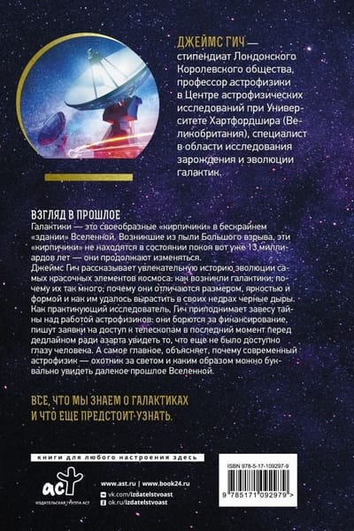 Галактики — это своеобразные «кирпичики» в бескрайнем «здании» Вселенной. Возникшие из пыли Большого Взрыва, эти «кирпичики» не находятся в состоянии покоя вот уже 13 миллиардов лет — они продолжают изменяться. Джеймс Гич рассказывает увлекательную историю эволюции самых красочных элементов космоса: как возникли галактики; почему их так много, почему они отличаются размером, яркостью и формой и как им удалось вырастить в своих недрах черные дыры. Как практикующий исследователь Гич приподнимает завесу тайны над работой астрофизиков: они борются за финансирование, пишут заявки на доступ к телескопам в последний момент перед дедлайном ради азарта увидеть то, что еще не было доступно глазу человека. А самое главное объясняет, почему современный астрофизик — охотник за светом, и каким образом можно буквально увидеть далекое прошлое Вселенной.