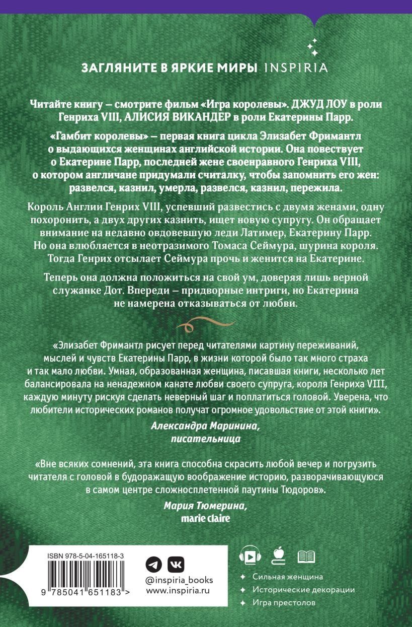 «Гамбит королевы» – первая книга цикла Элизабет Фримантл о выдающихся женщинах английской истории. Она повествует о Екатерине Парр, последней жене своенравного Генриха VIII, о котором англичане придумали считалку, чтобы запомнить его жен: развелся, казнил, умерла, развелся, казнил, пережила. Король Англии Генрих VIII, успевший развестись с двумя женами, одну похоронить, а двух других казнить, ищет новую супругу. Он обращает внимание на недавно овдовевшую леди Латимер, Екатерину Парр. Но она влюбляется в неотразимого Томаса Сеймура, шурина короля. Тогда Генрих отсылает Сеймура прочь и женится на Екатерине. Теперь она должна положиться на свой ум, доверяя лишь верной служанке Дот. Впереди – придворные интриги, но Екатерина не намерена отказываться от любви.