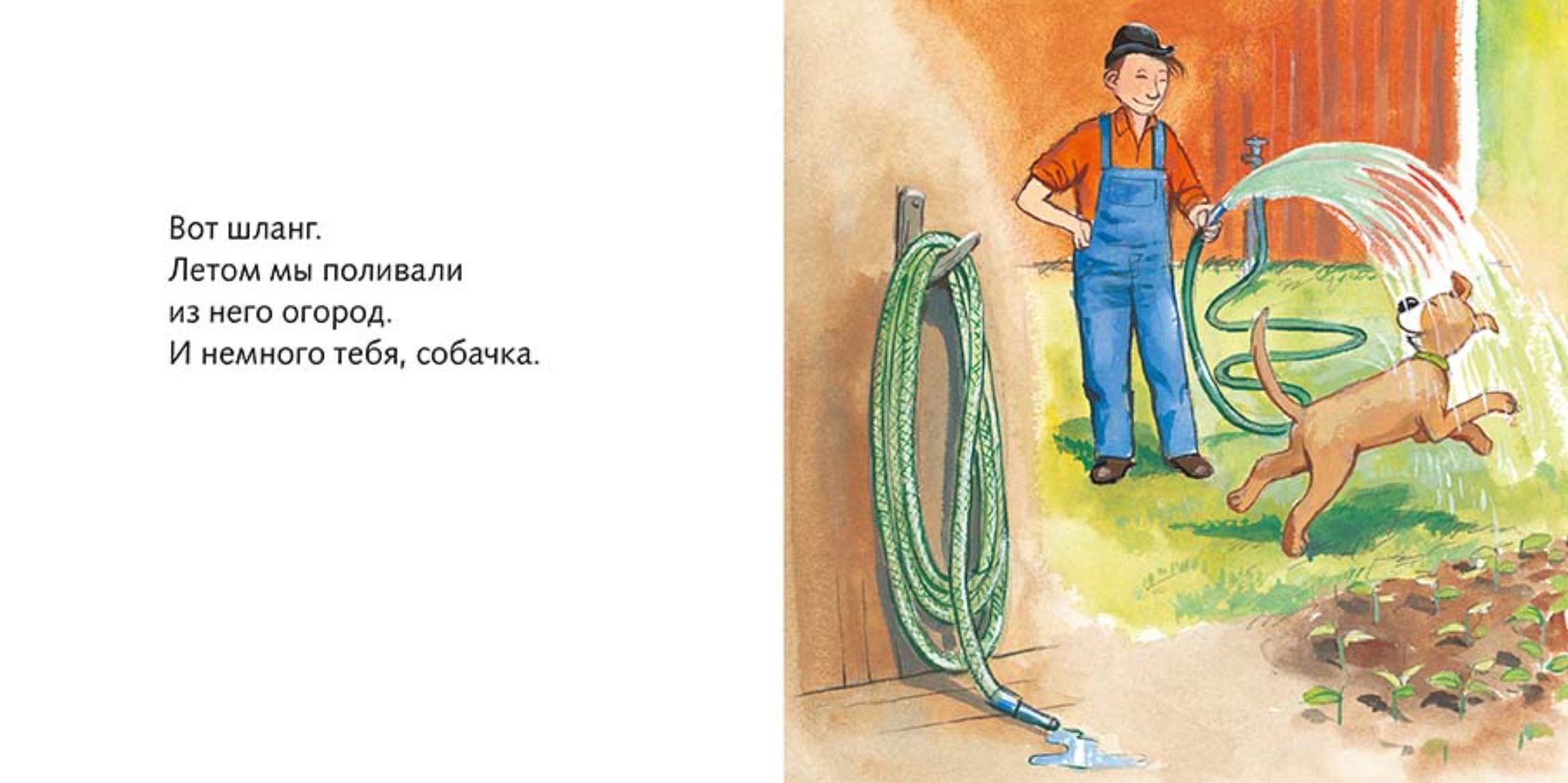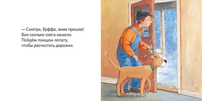 К Мулле Меку и Буффе пришла зима. Весь двор замело снегом – пора расчищать дорожки. Но для начала хорошо бы найти лопату. Мулле нашёл вилы, которыми рыхлил землю весной. Нашёл шланг, из которого поливал грядки летом. И нашёл грабли, которыми собирал опавшие листья осенью. Но где же лопата для снега? Да вот же она, спряталась за морозильником! Вместе с Буффой Мулле идёт во двор: сам расчищает дорожку к воротам, а помощница Буффа смахивает снег с машины своим хвостом, как метёлкой.