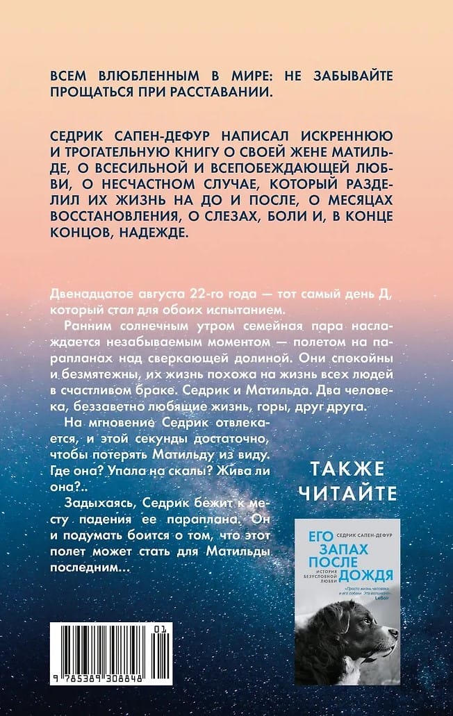 Седрик Сапен-Дефур написал искреннюю и трогательную книгу о своей жене Матильде, о всесильной и всепобеждающей любви, о несчастном случае, который разделил их жизнь на до и после, о месяцах восстановления, о слезах, боли и, в конце концов, надежде.