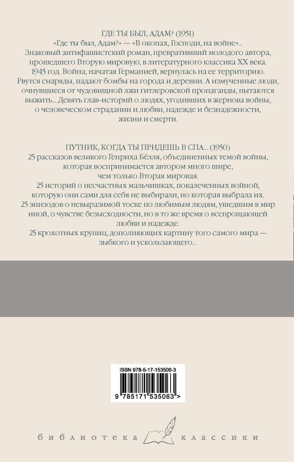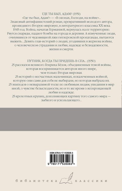 Знаковый антифашистский роман, превративший молодого автора, прошедшего Вторую мировую, в литературного классика ХХ века. 1945 год. Война, начатая Германией, вернулась на ее территорию. Рвутся снаряды, падают бомбы на города и деревни. А измученные люди, очнувшиеся от чудовищной лжи гитлеровской пропаганды, пытаются выжить... Девять глав-историй о людях, угодивших в жернова войны, о человеческом страдании и любви, надежде и безнадежности, жизни и смерти. «Путник, когда ты придешь в Спа...» 25 рассказов великого Генриха Бёлля, объединенных темой войны, которая воспринимается автором много шире, чем только Вторая мировая. 25 историй о несчастных мальчишках, покалеченных войной, которую они сами для себя не выбирали, но которая выбрала их. 25 эпизодов о невыразимой тоске по любимым людям, ушедшим в мир иной, о чувстве безысходности, но в то же время о всепрощающей любви и надежде. 25 крохотных крупиц, дополняющих картину того самого мира — зыбкого и ускользающего...