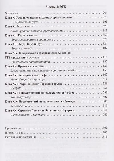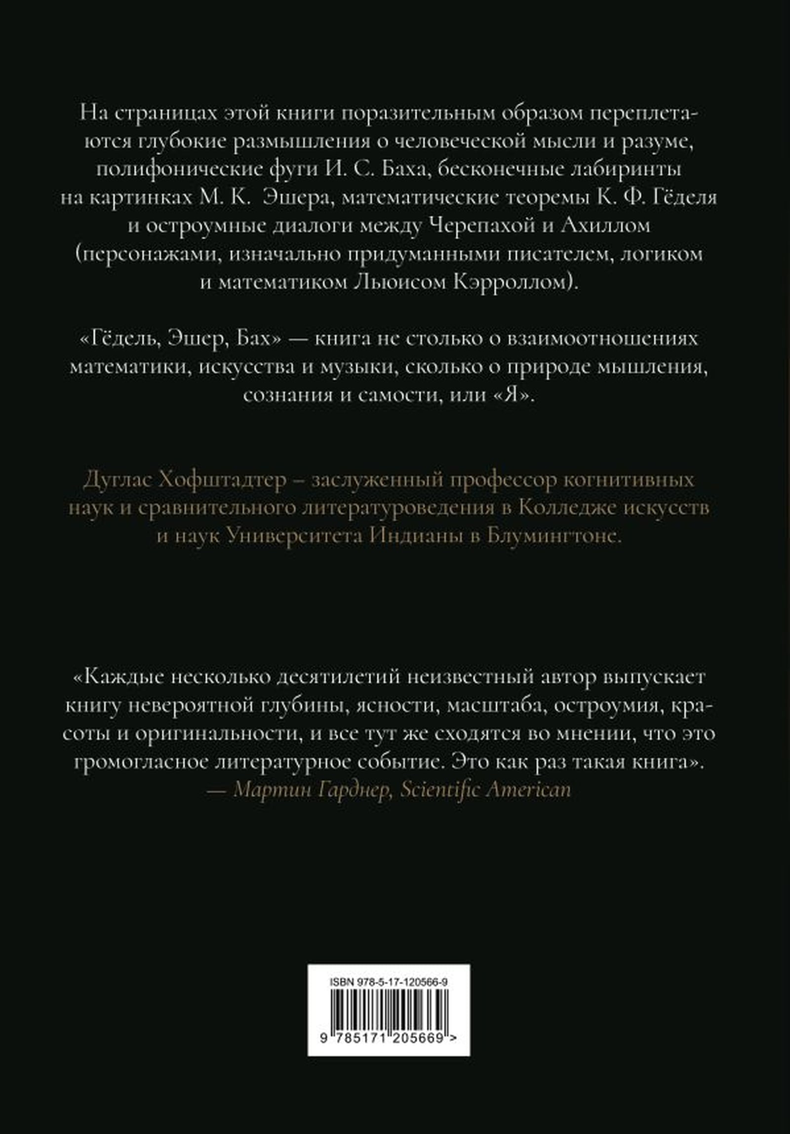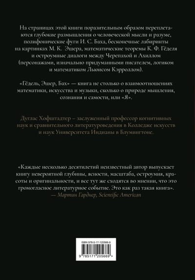 На страницах этой книги поразительным образом переплетаются глубокие размышления о человеческой мысли и разуме, полифонические фуги И. С. Баха, бесконечные лабиринты на картинках М. К. Эшера, математические теоремы К. Ф. Гёделя и остроумные диалоги между героями парадокса, придуманного сказочником, логиком и математиком Льюисом Кэрроллом. «Гёдель, Эшер, Бах» — книга не столько о взаимоотношениях математики, искусства и музыки, сколько о природе познания и скрытых неврологических механизмах, формирующих человеческое мышление.