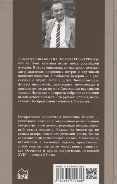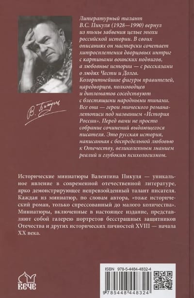 Исторические миниатюры Валентина Пикуля — уникальное явление в современной отечественной литературе, ярко демонстрирующее непревзойденный талант писателя. Каждая из миниатюр, по словам автора, «тоже исторический роман, только спрессованный до малого количества». Миниатюры, включенные в настоящее издание, представляют собой галерею портретов бесстрашных защитников Отечества и других исторических личностей XVIII — начала XX века.