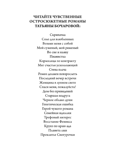 Невероятно чувственные остросюжетные романы Татьяны Бочаровой из серии «Детектив сильных страстей» задевают самые тонкие струны в женской душе, заставляя вспомнить все, о чем мечталось, да не сбылось. Они дарят надежду, что никогда не поздно все изменить!