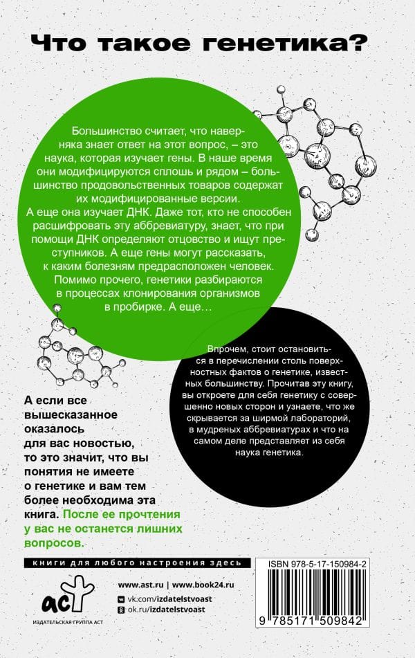 Большинство считает, что наверняка знает ответ на этот вопрос - это наука, которая изучает гены. В наше время они модифицируются сплошь и рядом – большинство продовольственных товаров содержат их модифицированные версии. А еще она изучает ДНК. Даже тот, кто не способен расшифровать эту аббревиатуру, знает, что при помощи ДНК определяют отцовство и ищут преступников. А еще гены могут рассказать, к каким болезням предрасположен человек. Помимо прочего, генетики разбираются в процессах клонирования – организмов в пробирке. А еще… В прочем, стоит остановиться в перечислении столь поверхностных фактов о генетике, известных большинству. В этой книге вы откроете для себя генетику с совершенно новых сторон и узнаете, что же скрывается за ширмой лабораторий, в замудреных аббревиатурах и что на самом деле представляет из себя наука генетика. А если все выше сказанное оказалось для вас новостью, то это значит, что вы понятия не имеете о генетике и вам тем более необходима эта книга. После ее прочтения у вас не останется лишних вопросов.