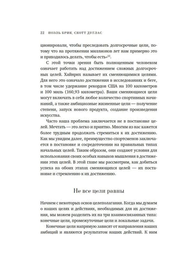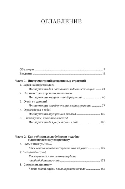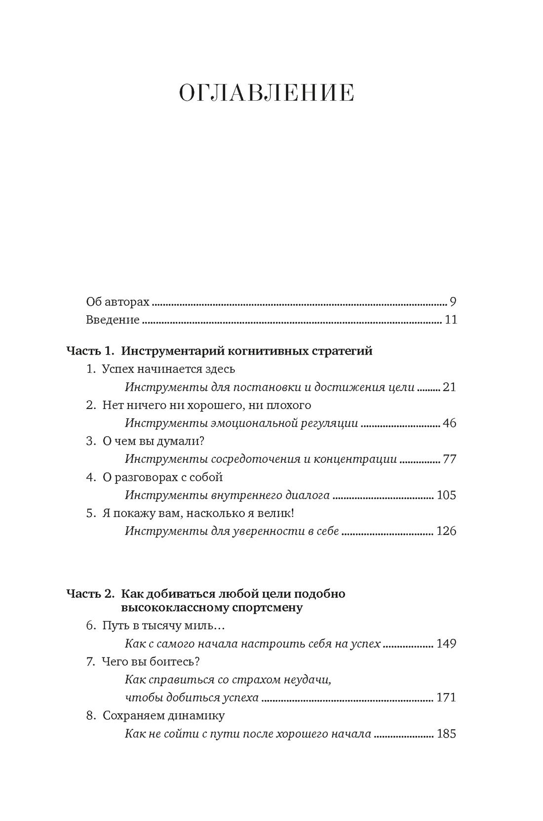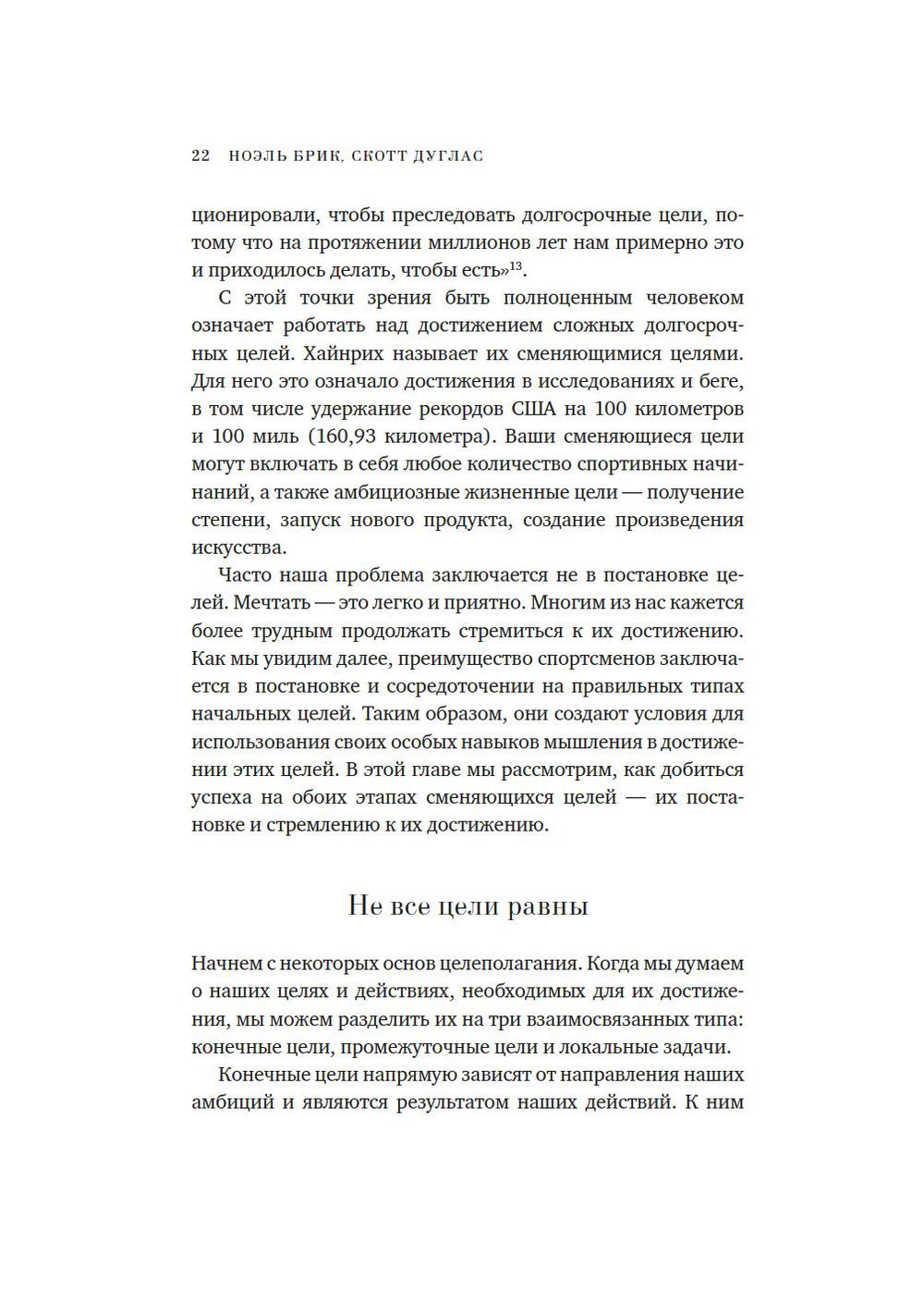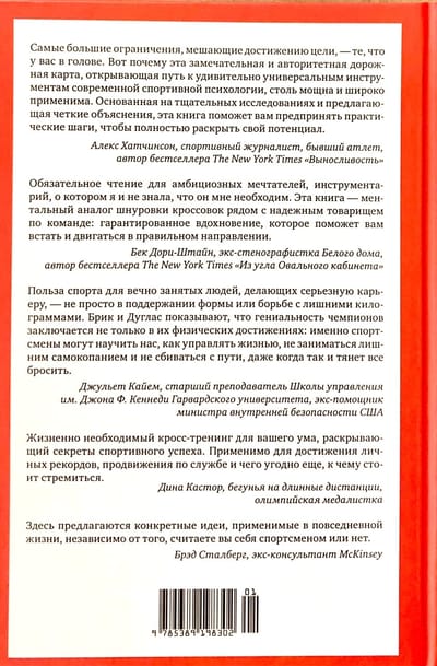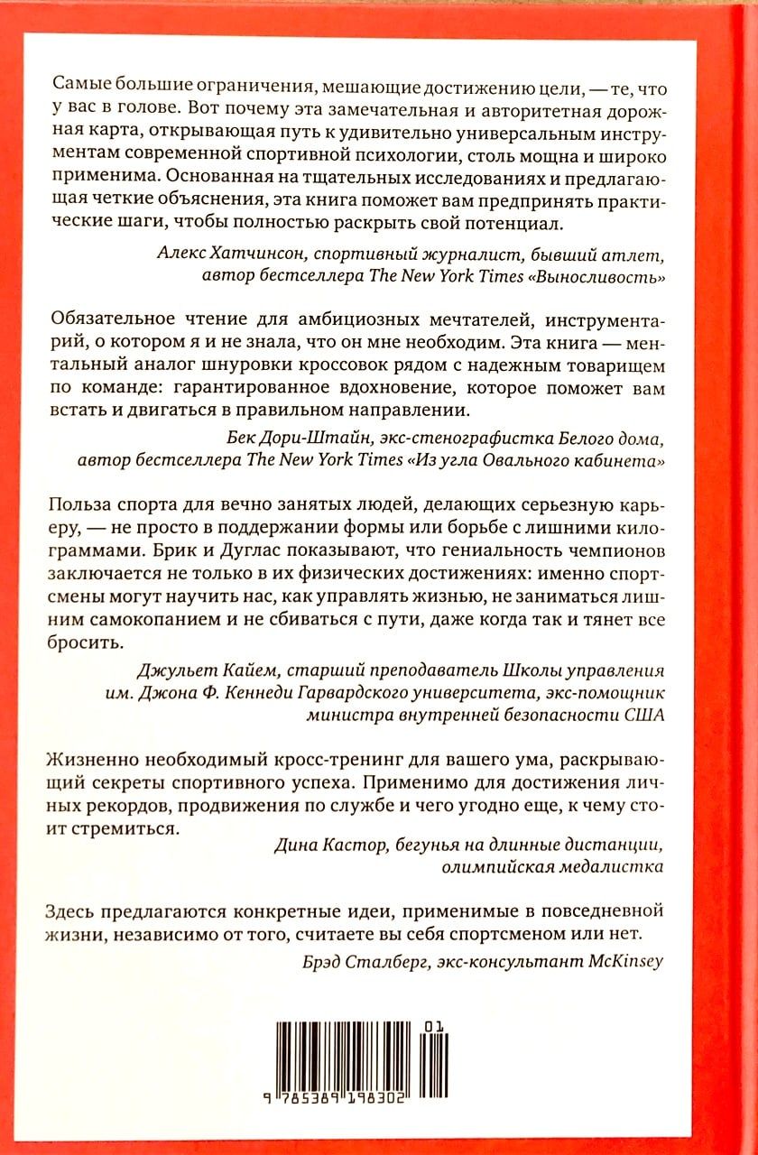 Специалист по спортивной психологии Ноэль Брик и журналист, автор нескольких книг о спорте Скотт Дуглас убеждены: стереотипы о «тупом качке» давно пора отправить в утиль. Современные исследования подтверждают то, что настоящие болельщики знали всегда: ни один спортсмен мирового класса — будь то олимпийский бегун, пловец или велосипедист, профессиональный баскетболист, бейсболист или футболист — не достигает успеха без мощной интеллектуальной работы. У чемпионов есть уникальные способы оценивать ситуацию, мотивировать себя и эффективно рассчитывать свое время и силы. Новейшие научные открытия помогают понять, как им это удается — и как каждый из нас может последовать их примеру. Даже если вершины, к которым вы стремитесь, не имеют отношения к спорту, вам пригодятся наборы когнитивных стратегий элитных спортсменов. Инструментарий, предлагаемый в этой книге, поможет добиться успеха в самых разных областях: подготовить грамотный бизнес-проект, блестяще защитить диссертацию, выигрышно подать себя на собеседовании, навсегда распрощаться с вредной привычкой... Брик и Дуглас соединяют новаторскую науку с конкретными кейсами из мира спорта, показывая, как легендарный марафонец Меб Кефлезиги работает со своим внутренним диалогом или как планирование по модели «если — то» помогло великому пловцу Майклу Фелпсу завоевать очередную золотую медаль на Олимпийских играх. В этой книге нет банальных списков очевидных советов; вместо прописных истин здесь много прикладной науки и много практики — психологических упражнений, таблиц-анкет для заполнения, а также полезные приложения: опросник «Профиль моих сильных сторон» (его можно заполнить еще до начала чтения книги, чтобы в конце оценить свой прогресс) и сценарий прогрессивной мышечной релаксации (техника, способствующая снижению стресса и тревоги как на телесном, так и на эмоциональном уровне).
