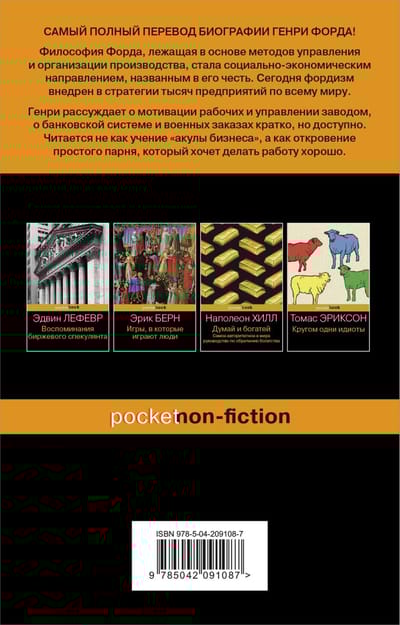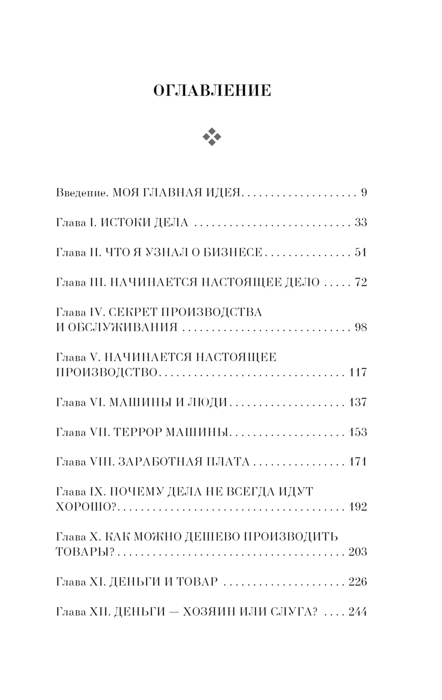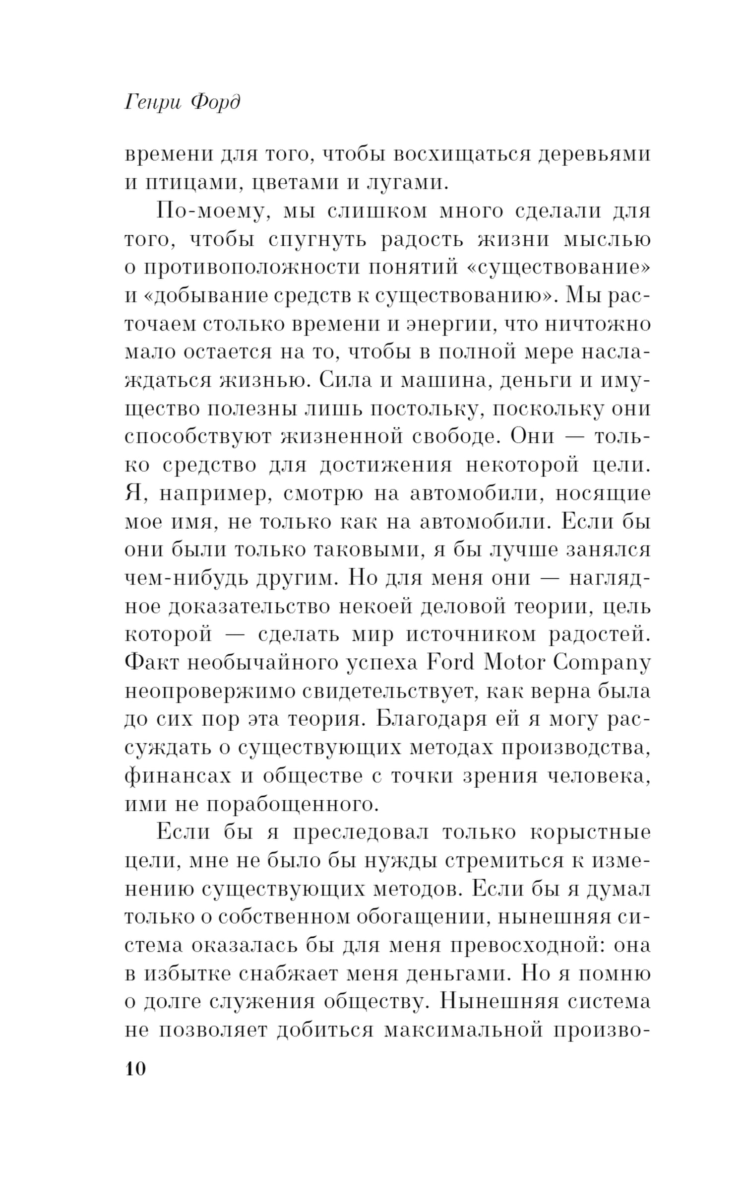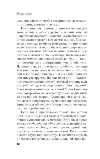 Генри рассуждает о мотивации рабочих и управлении заводом, о банковской системе и военных заказах кратко, но доступно. Читается не как учение «акулы бизнеса», а как откровение простого парня, который хочет делать работу хорошо.