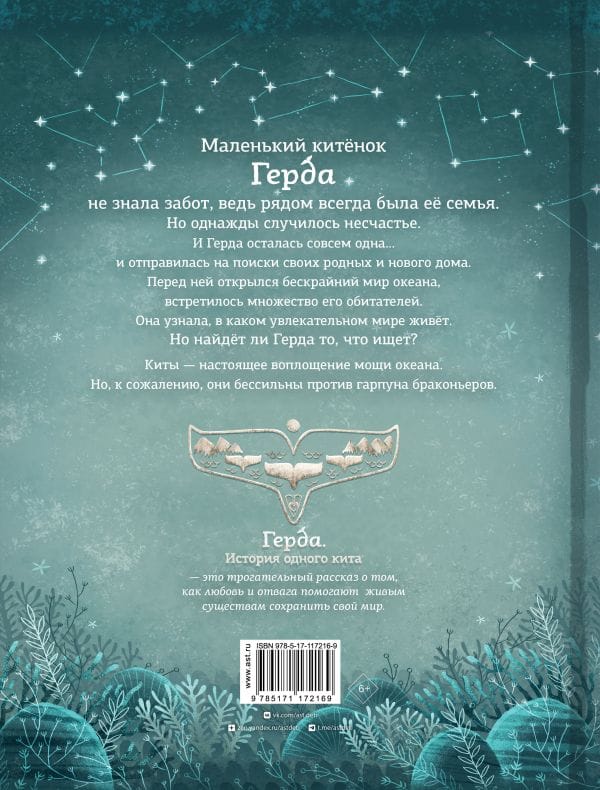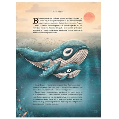 Мудрая и познавательная история о маленьком китенке Герде, пострадавшей от рук людей: на ее семью напали китобои. Книга для дошкольного возраста познакомит юных читателей с обитателями мирового океана и его экологией, расскажет, почему так важно бережно относиться к природе. Вечные темы — любовь и дружба, семья и независимость, одиночество и поиски себя в этом мире — обретают здесь особый смысл. Приключения китенка Герды научат слушать свое сердце, преодолевать страх и идти к мечте. Красочные иллюстрации художника Андриана Махо наполнены любовью к нашей голубой планете и ее жителям. Книга издана при поддержке Всемирного фонда дикой природы WWF — часть средств от продажи книги перечисляется в фонд. Покупая книгу, вы помогаете сохранить красоту Земли!