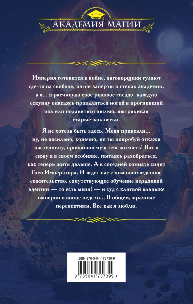 Империя готовится к войне, заговорщики гуляют где-то на свободе, изгои заперты в стенах академии, а я... я расчищаю свое родовое гнездо, каждую секунду опасаясь провалиться ногой в прогнивший пол или подавиться пылью, вытряхивая старые занавески. Я не хотела быть здесь. Меня привезли... ну, не насильно, конечно, но ты попробуй откажи наследнику, проявившему к тебе милость! Вот и сижу я в своем особняке, пытаясь разобраться, как теперь жить дальше. А в соседней комнате сидит Гнев Императора. И ждет нас с ним вынужденное сожительство, сопутствующее обучение нерадивой адептки — то есть меня! — и суд с клятвой владыке империи в конце недели... В общем, мрачные перспективы. Все, как я люблю.
