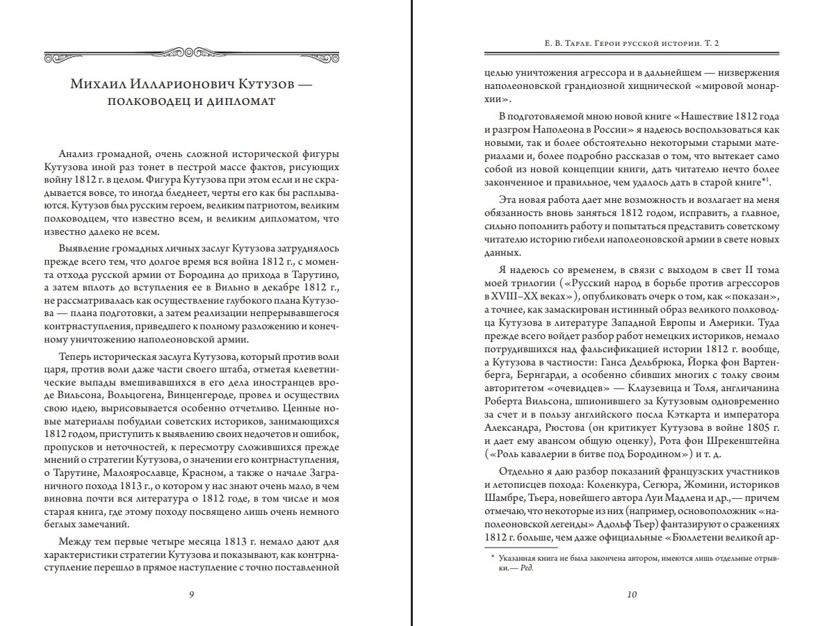Второй сборник «Герои русской истории» содержит труды, посвященные российской военной истории XIX—XX вв. В книгу входят: «М. И. Кутузов — полководец и дипломат», «Отечественная война 1812 г.», «Павел Степанович Нахимов», сборники очерков, статей и выступлений «Летописи русской славы», «Лица русской культуры», «Уроки истории» и биографический очерк Я. Л. Кранцфельда «Рабочий день Евгения Викторовича Тарле».