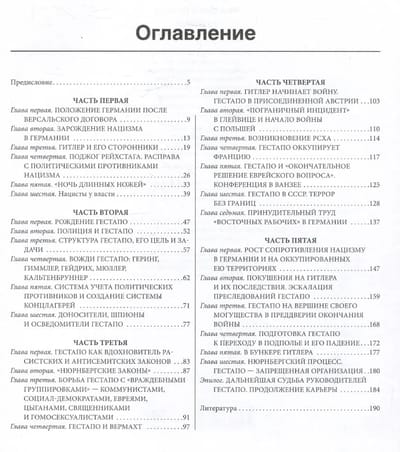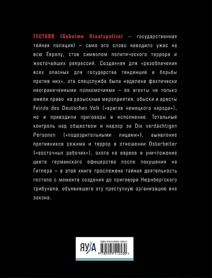 Гестапо (Geheime Staatspolizei – государственная тайная полиция) – само это слово наводило ужас на всю Европу, став символом политического террора и жесточайших репрессий. Созданная для «разоблачения всех опасных для государства тенденций и борьбы против них», эта спецслужба была наделена фактически неограниченными полномочиями – ее агенты имели право не только на розыскные мероприятия, обыски и аресты Feinde des Deutschen Volk («врагов немецкого народа»), но и приводили приговоры в исполнение. Тотальный контроль над обществом и надзор за Die verdächtigen Personen («подозрительными лицами»), выявление противников режима и террор в отношении Ostarbeiter («восточных рабочих»), охота на евреев и уничтожение цвета германского офицерства после покушения на Гитлера – в этой книге прослежена тайная деятельность Гестапо с момента создания до приговора Нюрнбергского трибунала, объявившего эту преступную организацию вне закона.
