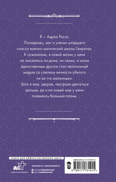 Я — Адрэа Расхэ. Попаданец, маг и ученик младшего класса военно-магической школы Ганратаэ. К сожалению, в новой жизни у меня не оказалось ни дома, ни семьи, а моим единственным другом стал автономный модуль со слепком личности убитого ни за что мальчишки. Зато я жив, здоров, настроен двигаться дальше, да и на новый мир у меня появились большие планы.