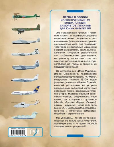 Эта книга написана простым и понятным языком и проиллюстрирована высококлассными рисунками и эксклюзивными фотографиями крупнейших самолетов мира. Она познакомит читателей с крылатыми машинами с огромным размахом крыльев, оснащенными мощными реактивными или турбовинтовыми двигателями, которые могут перевозить сотни пассажиров, различные тяжелые и крупногабаритные грузы, а также их предшественниками. От легендарного «Ильи Муромца» Игоря Сикорского, германского бомбардировщика фирмы «Сименс», воздушных гигантов 1930-х годов (например, самолета «Максим Горькии?», который размерами не уступал современным лайнерам), гигантских летающих лодок, воздушных гигантов Второй мировой войны и самолетов-гигантов опередивших свое время до воздушных грузовиков («Антей», «Руслан», «Мрия», «Белуха»), самых крупных авиалайнеров (Боинг-747 и Эи?рбас A380), вертолетов-гигантов и гигантских самолетов-кораблей — экранопланов.