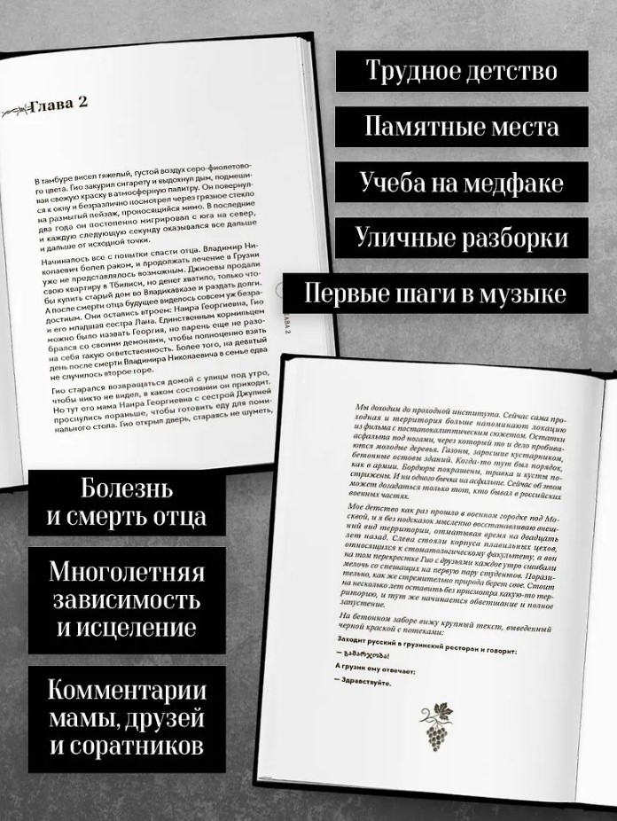 Писатель Владимир Еркович провел большое количество времени с самим Гио и его близкими людьми и восстановил весь путь становления Георгия: от тяжелого детства в небольшом городе до формирования одного из самых ярких артистов эпохи. Лаконичное оформление книги делает ее отличным артефактом для домашней библиотеки каждого, кто уважает творчество артиста.