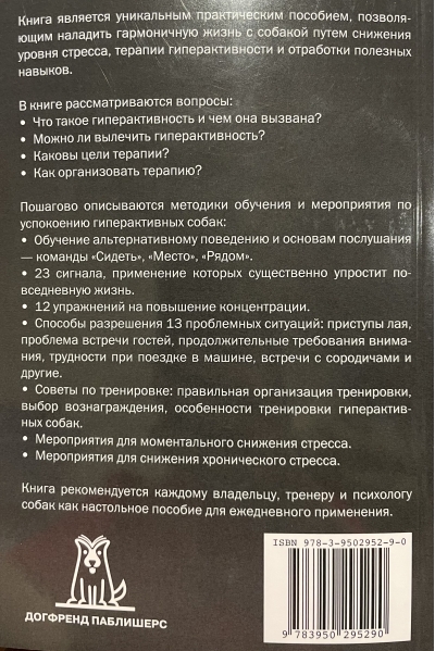 Книга является уникальным практическим пособием, позволяющим наладить гармоничную жизнь с собакой путем снижения уровня стресса, терапии гиперактивности и отработки полезных навыков. В книге рассматриваются вопросы: Что такое гиперактивность и чем она вызвана? Можно ли вылечить гиперактивность? Каковы цели терапии? Как организовать терапию? Пошагово описываются методики обучения и мероприятия по успокоению гиперактивных собак: Обучение альтернативному поведению и основам послушания - команды "Сидеть", "Место", "Рядом". 23 сигнала, применение которых существенно упростит повседневную жизнь. 12 упражнений на повышение концентрации. Способы разрешения 13 проблемных ситуаций: приступы лая, проблема встречи гостей, продолжительные требования внимания, трудности при поездке в машине, встречи с сородичами и другие. Советы по тренировке: правильная организация тренировки, выбор вознаграждения, особенности тренировки гиперактивных собак. Мероприятия для моментального снижения стресса. Мероприятия для снижения хронического стресса. Книга рекомендуется каждому владельцу, тренеру и психологу собак как настольное пособие для ежедневного применения.