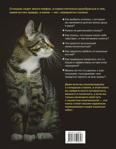 Как выбрать котенка, с которым вы проживете долгую жизнь душа в душу? Нужно ли мыть и расчесывать кошку? Как понять, что кошка плохо себя чувствует, и чем ей можно помочь? Что кроется за кошачьей нечистоплотностью? Как защитить мебель от кошачьих когтей? Как правильно запретить что-то кошке и эффективны ли при этом наказания? Можно ли что-то сделать с еженощными "тыгыдыками" или придется терпеть их всю жизнь?..