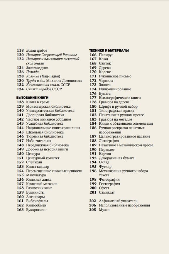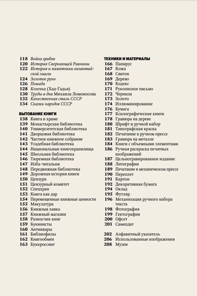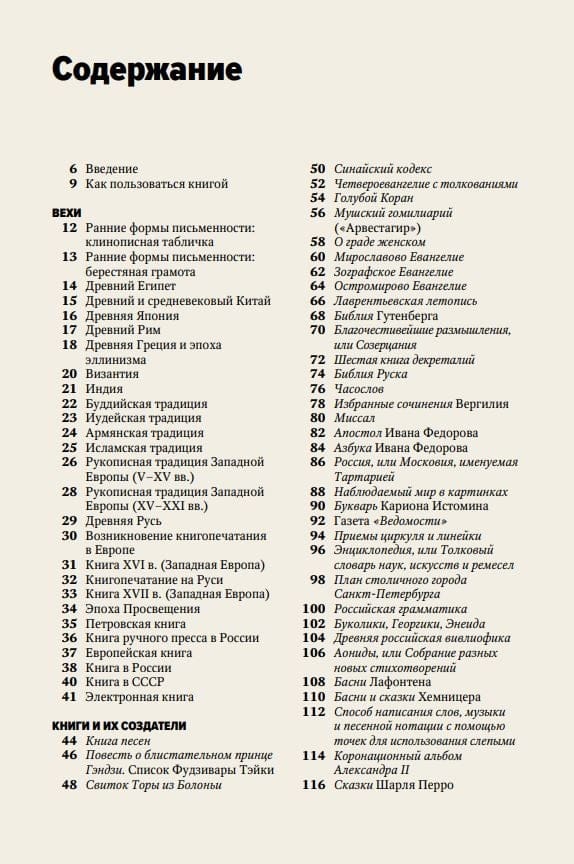Книга делится на четыре части. Первая часть посвящена вехам истории создания книг, вторая — книжным артефактам (книгам и свиткам), в третьей авторы рассказывают о бытовании книги, то есть о том, как книги живут и распространяются среди людей (все самое интересное о частных библиотеках, коллекциях, магазинах). Из четвертой части вы узнаете о технологиях (техниках создания иллюстраций, тиражных способах воспроизведения изображений, шрифтах и др.).