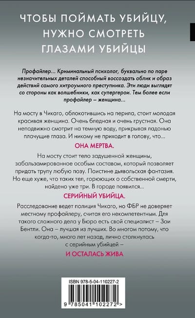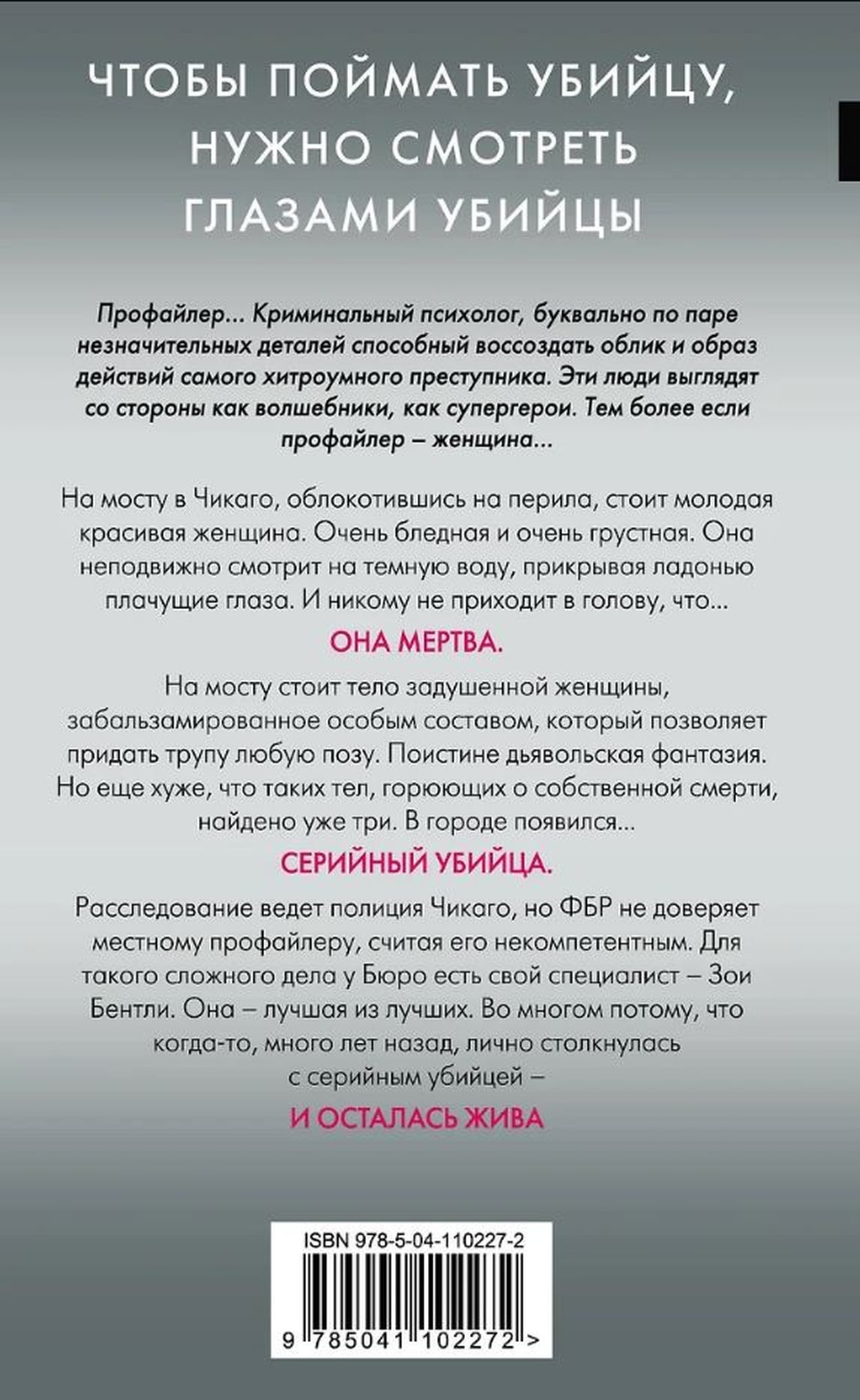 На мосту в Чикаго, облокотившись на перила, стоит молодая красивая женщина. Очень бледная и очень грустная. Она неподвижно смотрит на темную воду, прикрывая ладонью плачущие глаза. И никому не приходит в голову, что… Она мертва. На мосту стоит тело задушенной женщины, забальзамированное особым составом, который позволяет придать трупу любую позу. Поистине дьявольская фантазия. Но еще хуже, что таких тел, горюющих о собственной смерти, найдено уже три. В городе появился… Серийный убийца. Расследование ведет полиция Чикаго, но ФБР не доверяет местному профайлеру, считая его некомпетентным. Для такого сложного дела у Бюро есть свой специалист - Зои Бентли. Она - лучшая из лучших. Во-многом потому, что когда-то, много лет назад, лично столкнулась с серийным убийцей - и осталась жива…