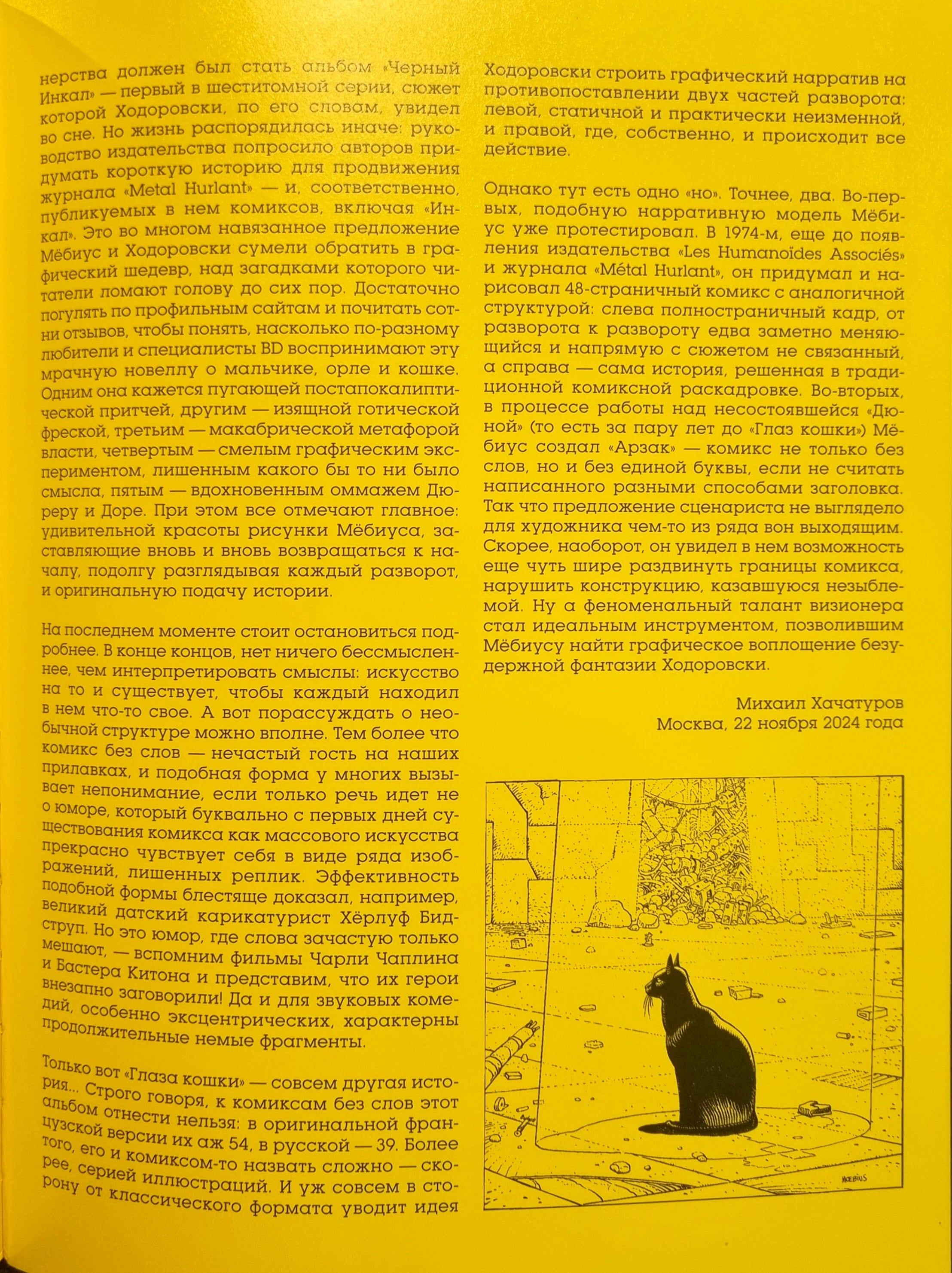 В 1974 году Жан Жиро – настоящее имя Мёбиуса – вместе с режиссером Алехандро Ходоровски приступил к созданию фильма «Дюна». Однако проекту не суждено было выйти на экраны. Алехандро впал в глубокую депрессию и на этом фоне начал писать сюжет графического романа, к которому Жан Жиро создал потрясающие иллюстрации. Так на свет появились «Глаза кошки».