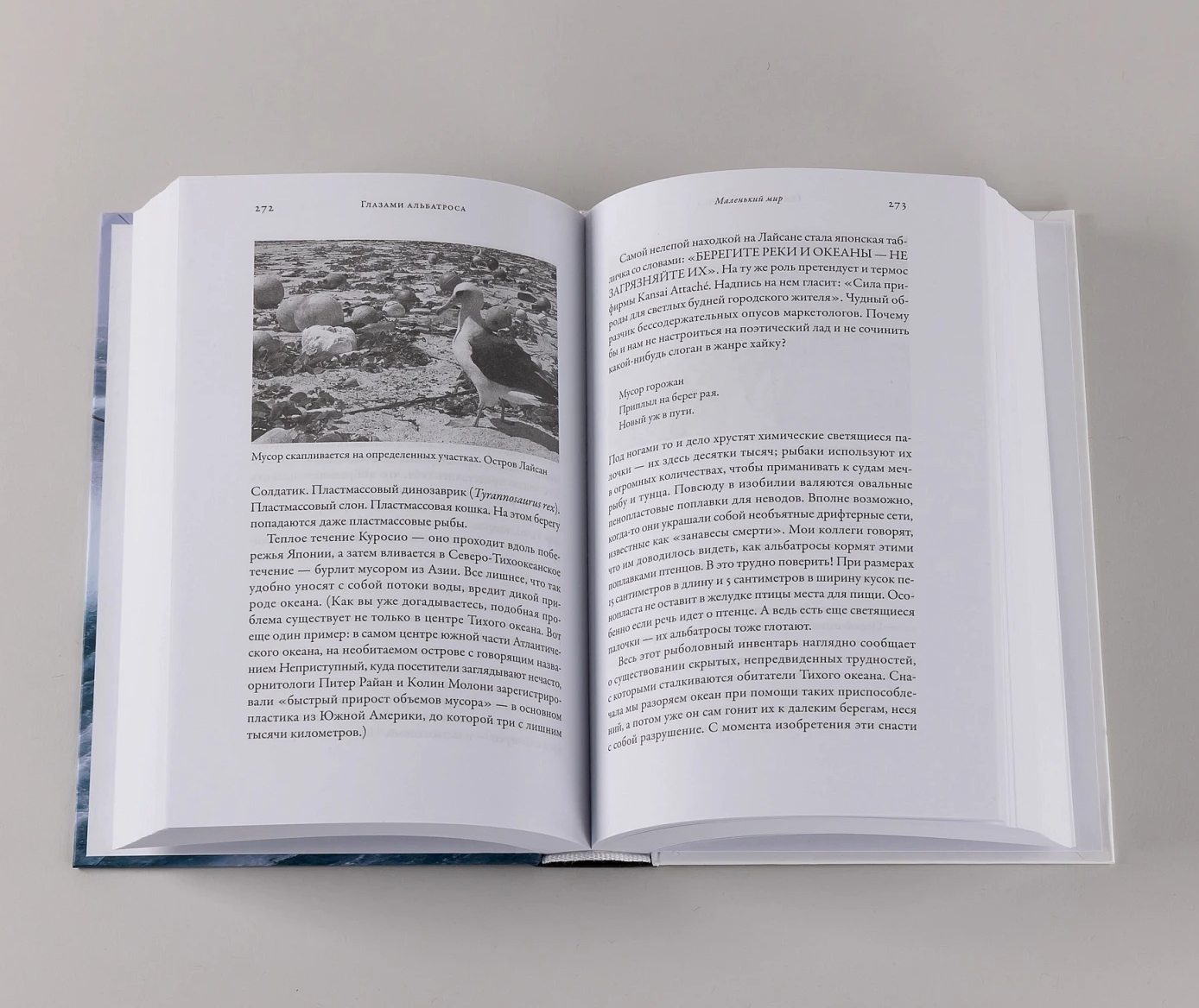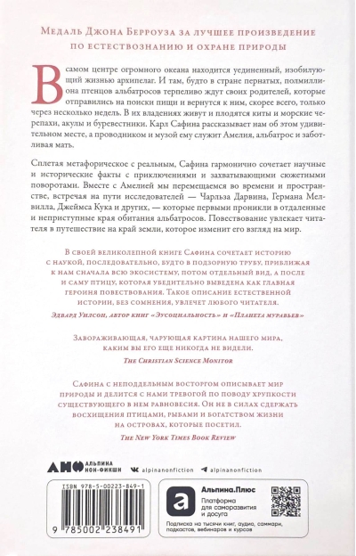 На наших глазах разворачивается драматичная и поэтическая история борьбы и надежды, исключительной выносливости и жизненной стойкости. Стремясь узнать больше об альбатросах, попутно автор знакомится со многими представителями дикой природы, обитающими в океане. Сафине удается не просто увидеть мир, в котором они живут, но и взглянуть на него их глазами. Вместе с Амелией мы путешествуем в пространстве и времени, проникая в отдаленные и неприступные края обитания альбатросов.