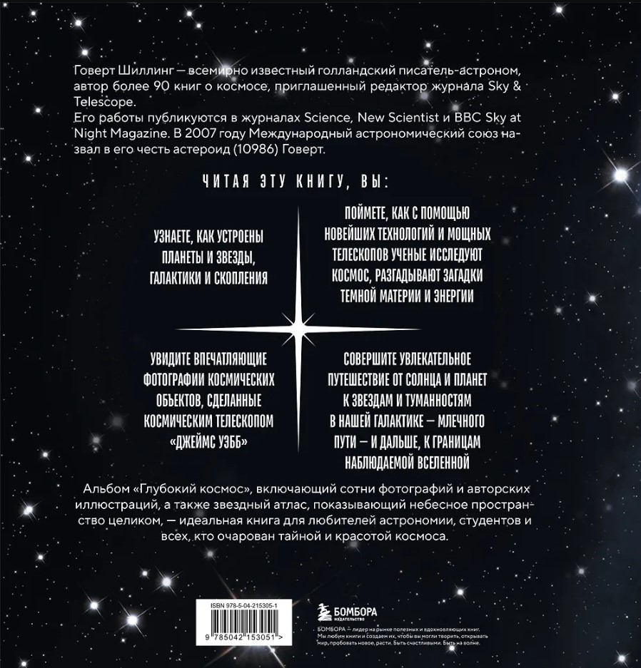 Книга «Глубокий космос» — уникальное иллюстрированное издание для всех, кто стремится понять устройство космоса через завораживающие фотографии и понятные объяснения. Это не просто книга — это увлекательное путешествие от Солнечной системы до самых отдалённых уголков наблюдаемой Вселенной, раскрывающее загадки рождения и гибели звёзд, устройство галактик, истории сверхмассивных чёрных дыр, тёмной материи и энергии. Благодаря сотням ярких снимков, включая новые кадры с космического телескопа Джеймса Уэбба, и звёздному атласу для самостоятельных наблюдений книга станет ценным и вдохновляющим подарком для думающей аудитории. Для всех, кто интересуется астрономией и космосом.