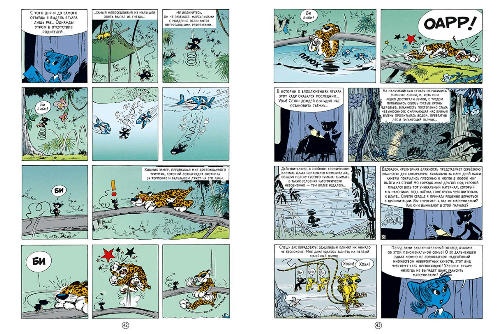 В первой истории Спиру и Фантазио, недавно вернувшиеся из дальней экспедиции, получают приглашение на конференцию «Открывая мир», но не как участники, а как зрители. Оказалось, что пока друзья изучали жизнь горных горилл на склонах Килимакали, коллега Фантазио по журналу «Комарик» Секкотин тоже времени даром не теряла. Несколько месяцев их съёмочная группа блуждала в дебрях палумбийской сельвы в надежде увидеть хотя бы одного марсупилами. В конце концов удача им улыбнулась, да ещё как! Они стали свидетелями знакомства парочки замечательных представителей этого редчайшего вида, и смогли запечатлеть трогательную историю их отношений и появление на свет троих чудесных марсупиламишек! Снятый Секкотин документальный фильм раскрыл многие секреты марсупилами, дав объяснение их феноменальным способностям и уникальным техникам выживания, таким, как умение вязать сложнейшие узлы, строить хитроумное гнездо с механизмами защиты от врагов и особая диета, основу которой составляют свежевыловленные пираньи.