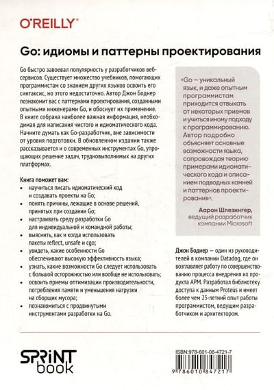 Go быстро завоевал популярность у разработчиков веб-сервисов. Существует множество учебников, помогающих программистам со знанием других языков освоить его синтаксис, но этого недостаточно. Автор Джон Боднер познакомит вас с паттернами проектирования, созданными опытными инженерами Go, и обоснует их применение. В книге собрана наиболее важная информация, необходимая для написания чистого и идиоматического кода. Начните думать как Go-разработчик, вне зависимости от уровня подготовки. В обновленном издании также рассказывается и о современных инструментах Go, упрощающих решение задач, трудновыполнимых на других платформах.